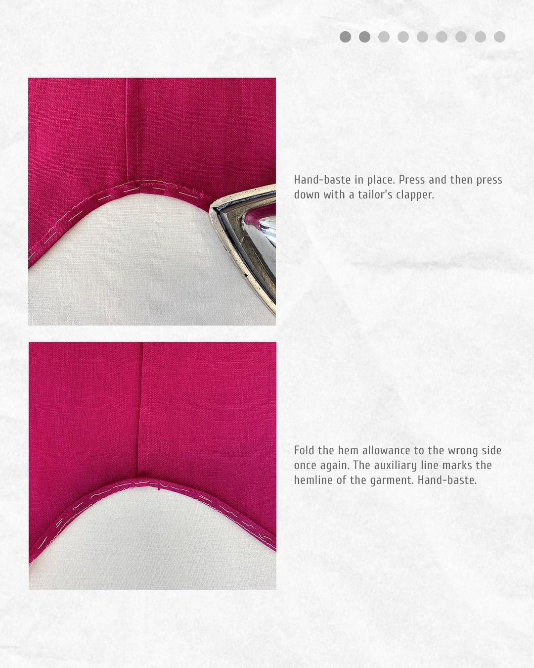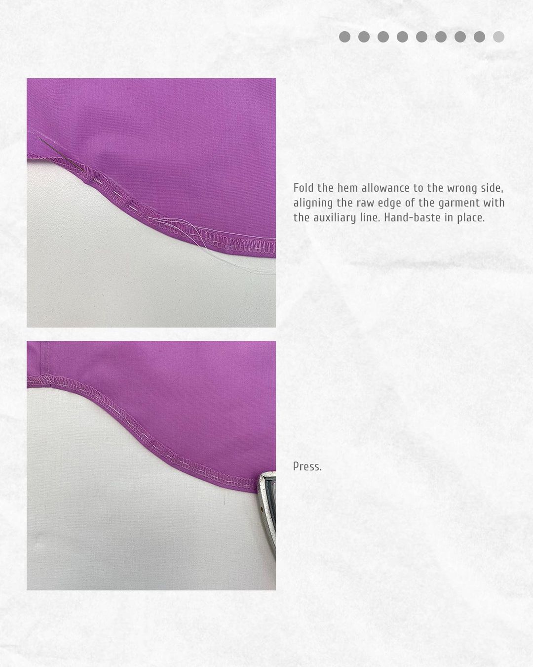 Fold the hem allowance to the wrong side once again. The auxiliary line marks the hemline of the garment. Hand-baste.