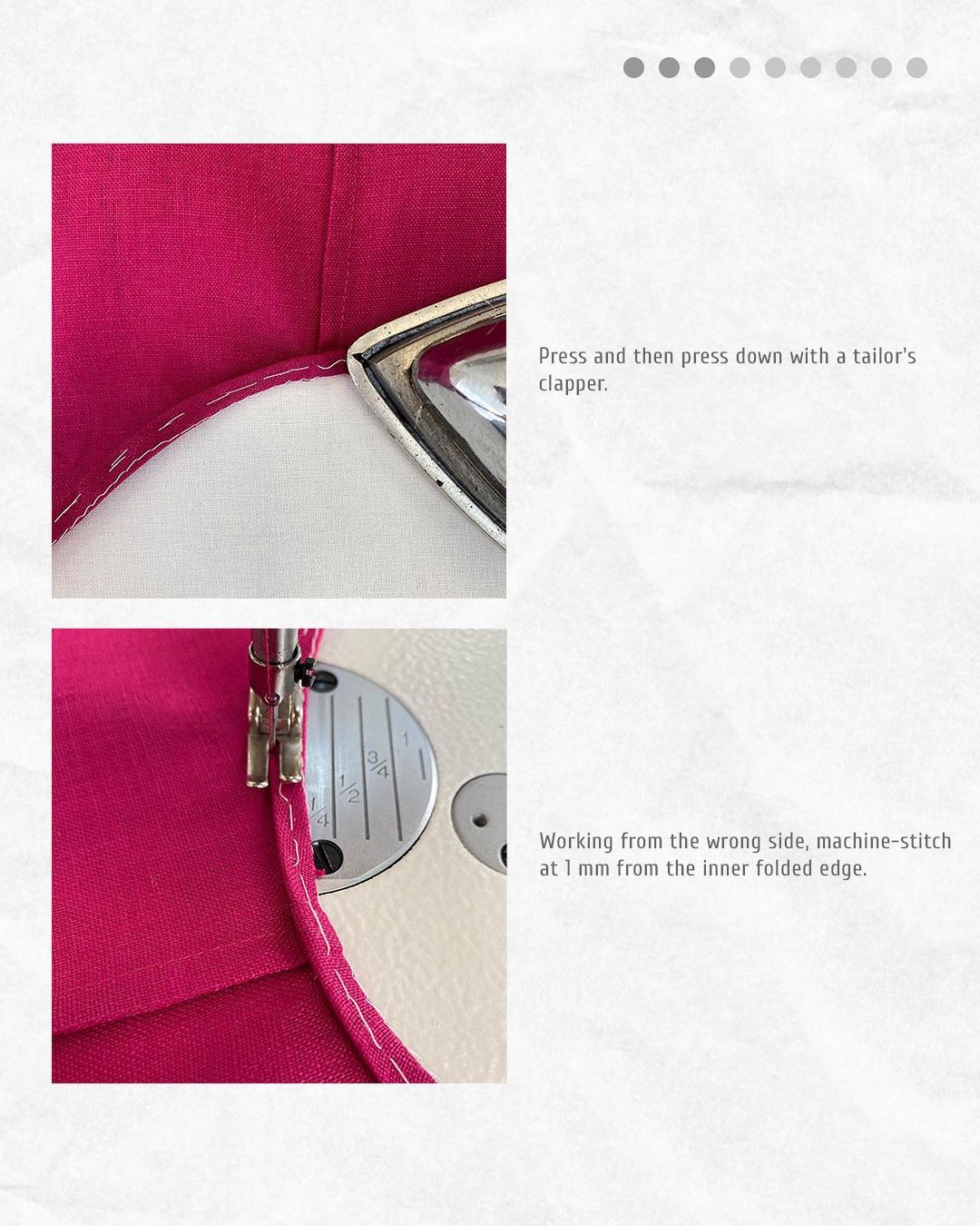 Fold the hem allowance to the wrong side by 6–7 mm (1/4") and then machine-stitch at 2 mm from the fold.