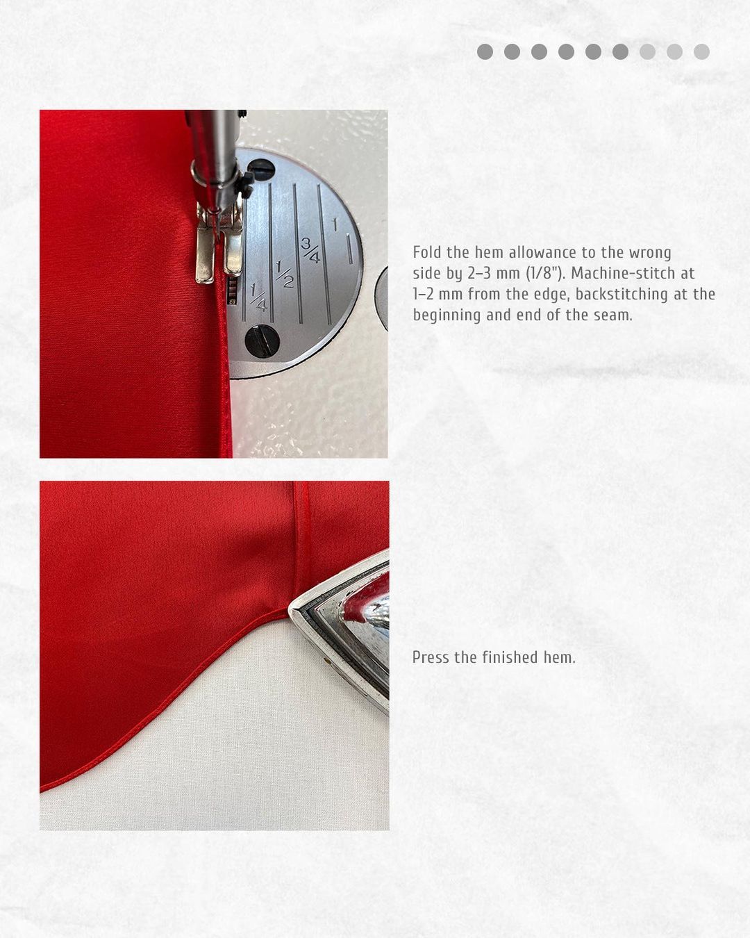 Fold the hem allowance to the wrong side by 2–3 mm (1/8"). Machine-stitch at 1–2 mm from the edge, backstitching at the beginning and end of the seam.