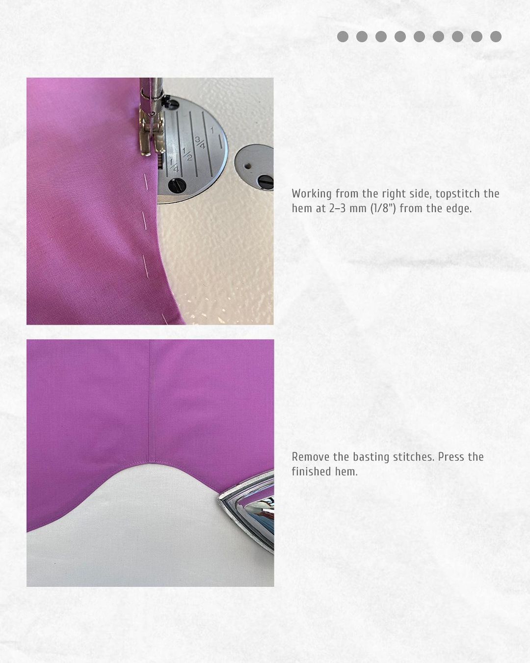 Working from the right side, topstitch the hem at 2–3 mm (1/8") from the edge.