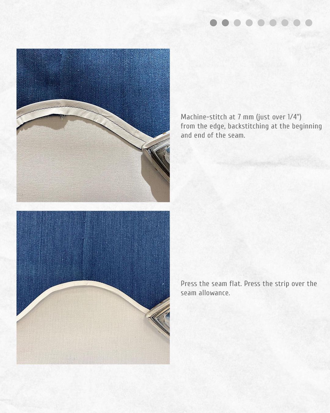 Machine-stitch at 7 mm (just over 1/4") from the edge, backstitching at the beginning and end of the seam.