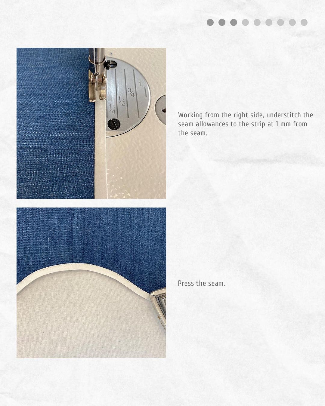 Working from the right side, understitch the seam allowances to the strip at 1 mm from the seam.