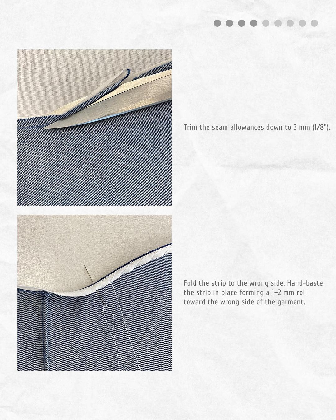 Fold the strip to the wrong side. Hand-baste the strip in place forming a 1-2 mm roll toward the wrong side of the garment.