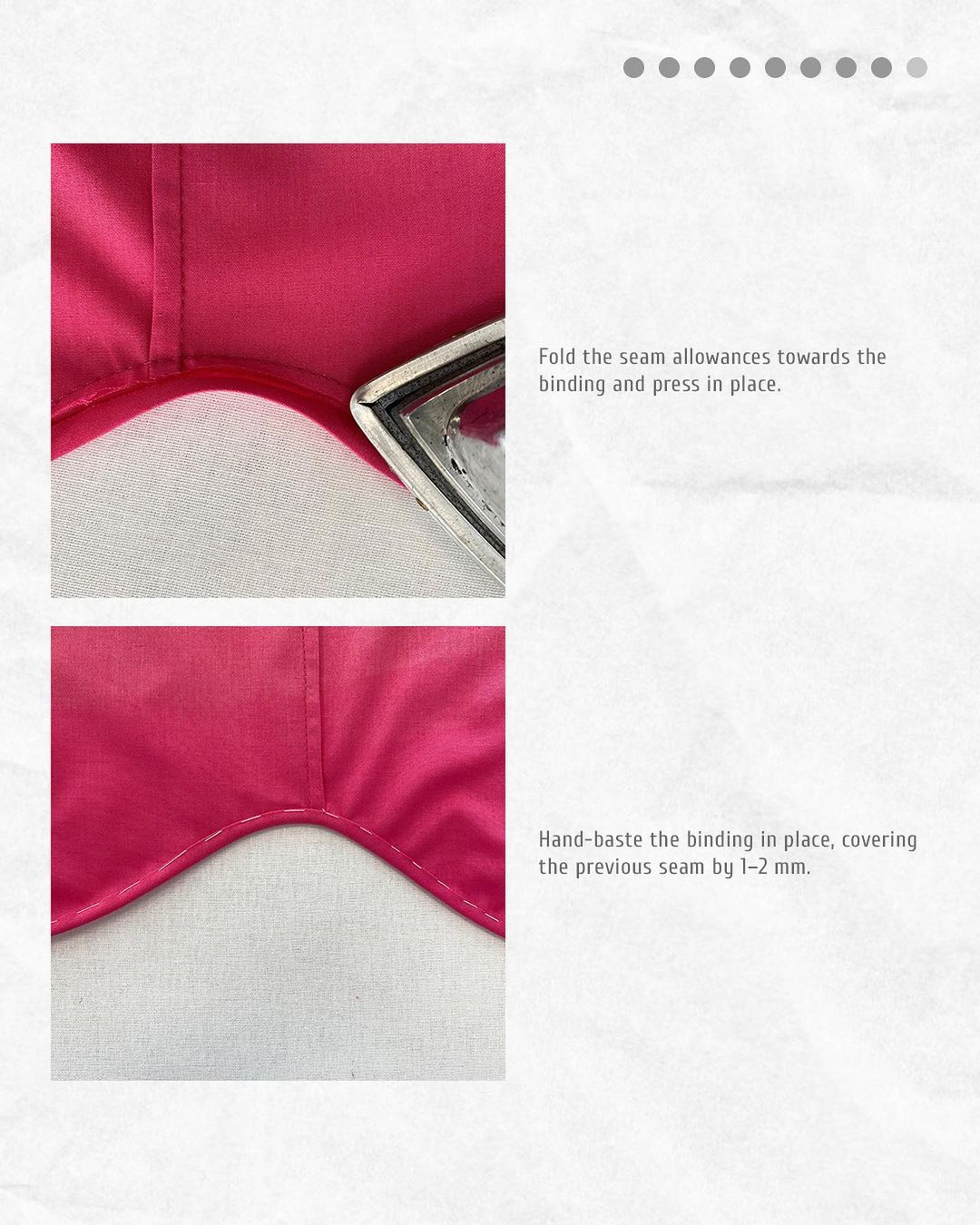 Hand-baste the binding in place, covering the previous seam by 1–2 mm.