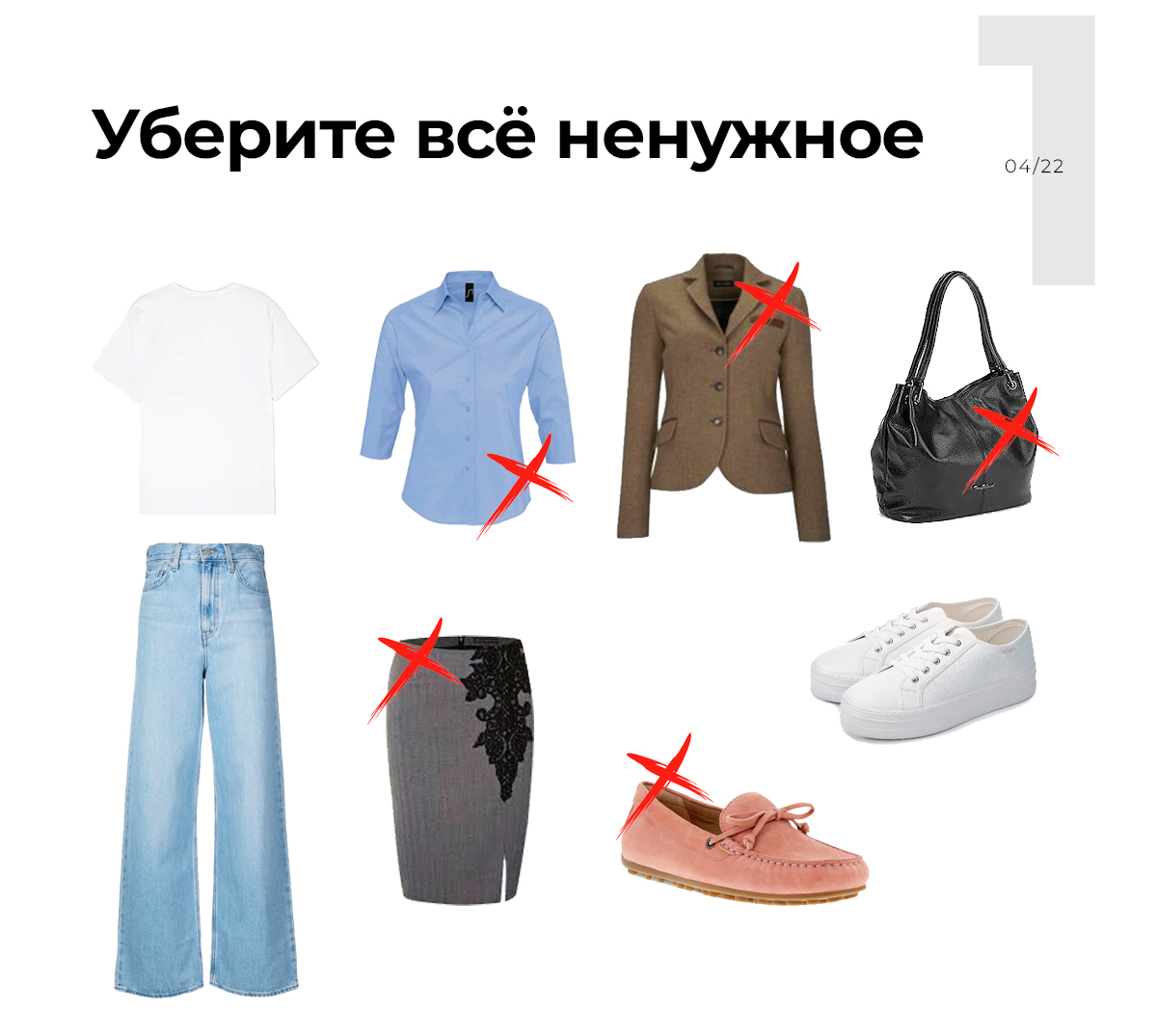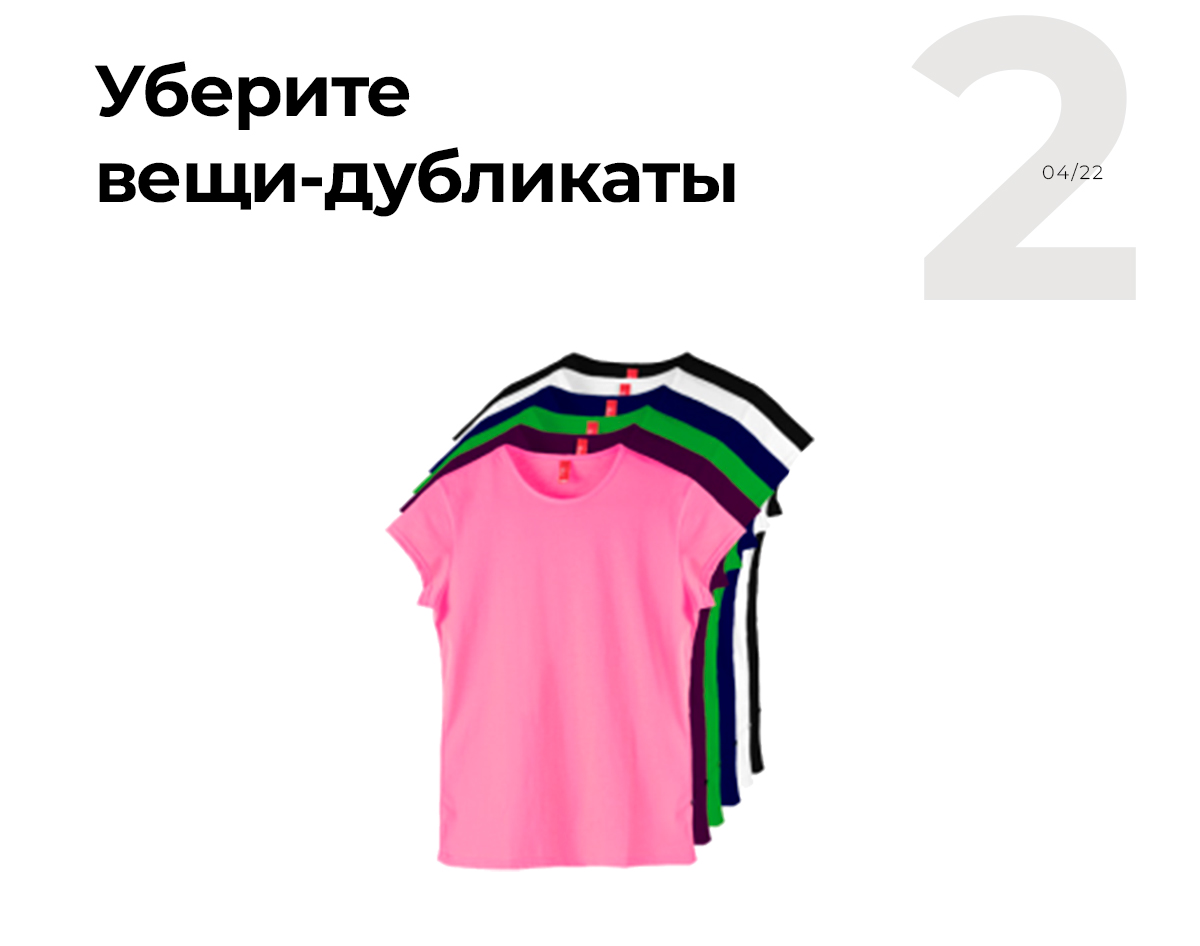Не стоит клонировать вещи в гардеробе. Десять футболок разного цвета = одна футболка. Их смысловая нагрузка в образе одинаковая, как и одинаковы принципы построения самих образов, поэтому не надо.