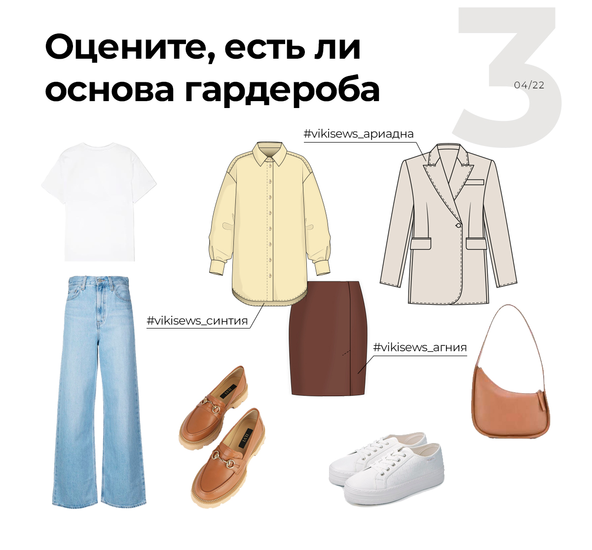 Посмотрите, есть ли у вас основа гардероба, то есть то, на чем мы будем строить образы. Важно! База индивидуальна. Это значит, что нет универсального списка базовых вещей для всех. Она сильно зависит от Вашего характера, предпочтений и образа жизни. Обычно это несложные вещи, которые легко сочетаются между собой и с другими, более акцентными вещами.