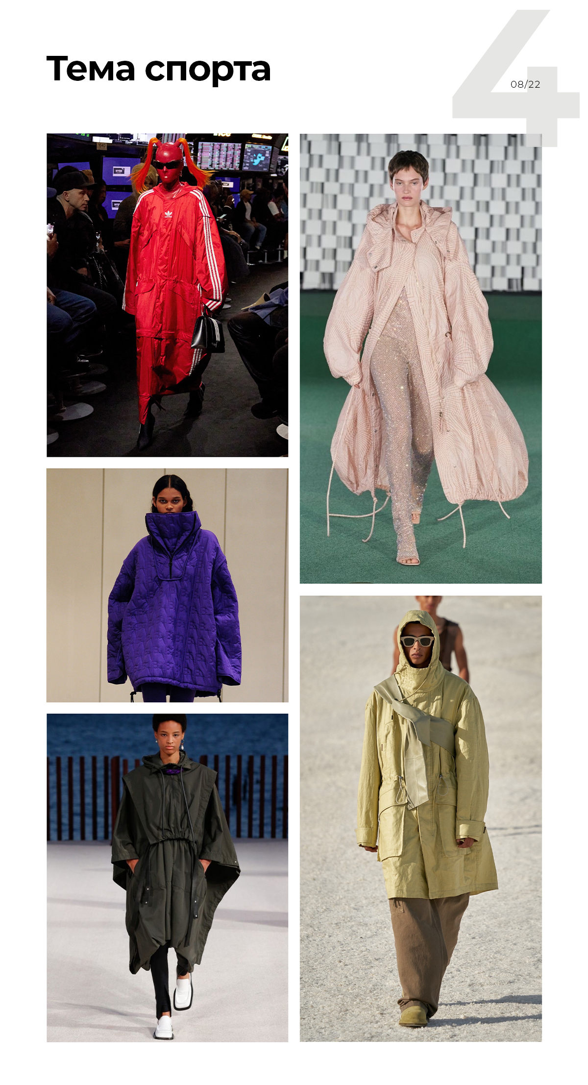 Объемные парки и анораки — отличное дополнение к стилю спорт-шик. Носить их не обязательно только со спортивным костюмом. Смело комбинируйте с романтичными платьями или костюмными брюками, например.