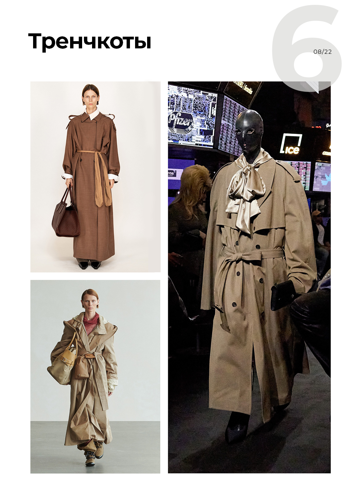 Выбор современных тренчкотов сейчас очень обширный. В топе объемные и достаточно длинные, как Сибил и Абигейл. Из свежих трендов — «франкенштейны» из разных тканей или фактур, как Пэйтон.
