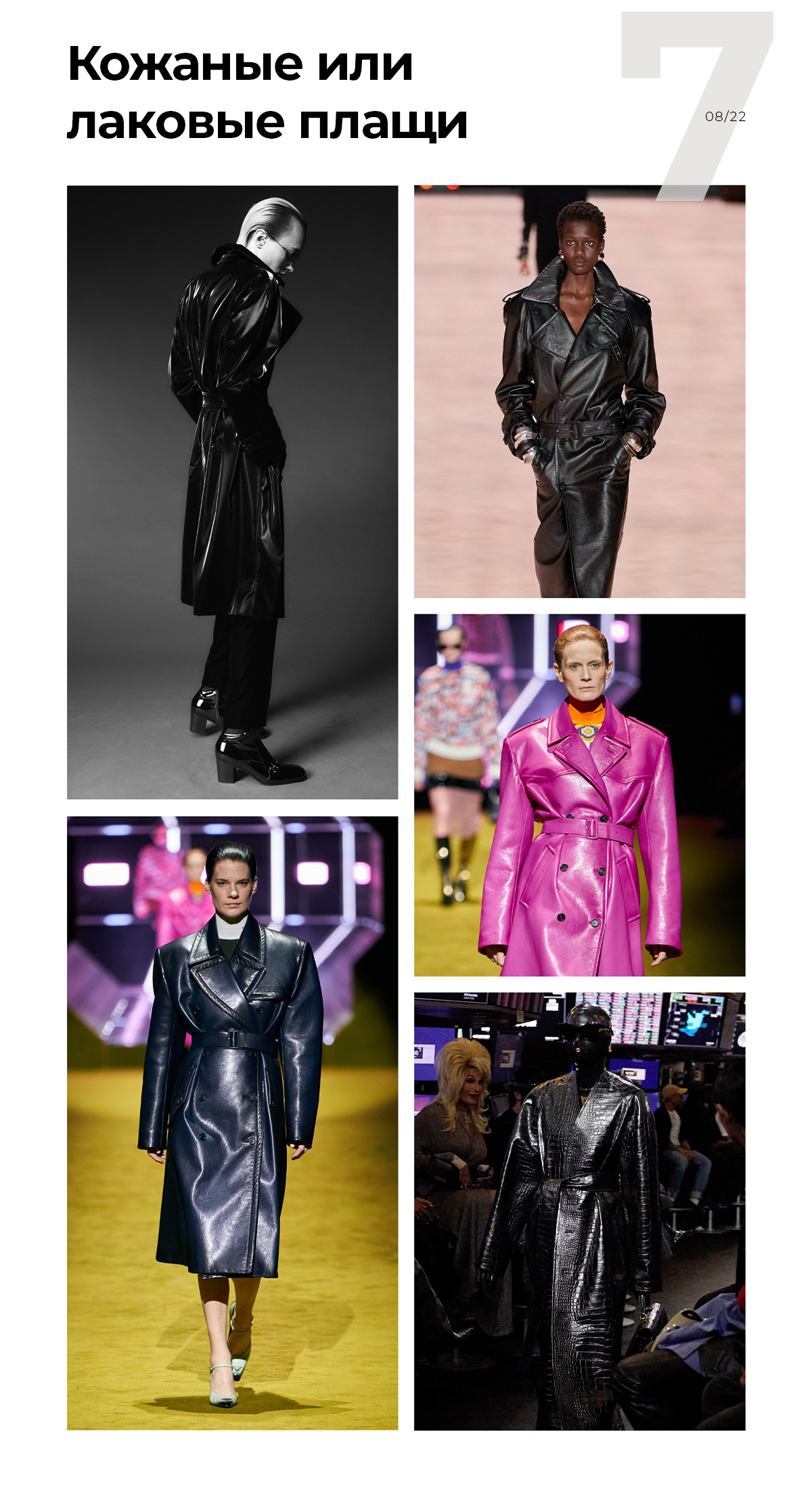 Кожаные или лаковые плащи — это супермодно. Среди выкроек Vikisews обратите внимание на пальто Глэдис и Фрида. Сюда же можно добавить не сбавляющий темпа тренд на фактуру кожи, и если вы ищете не плащ, а куртку, то сшить можно тонкую Фелисити или утепленную Аурелия.