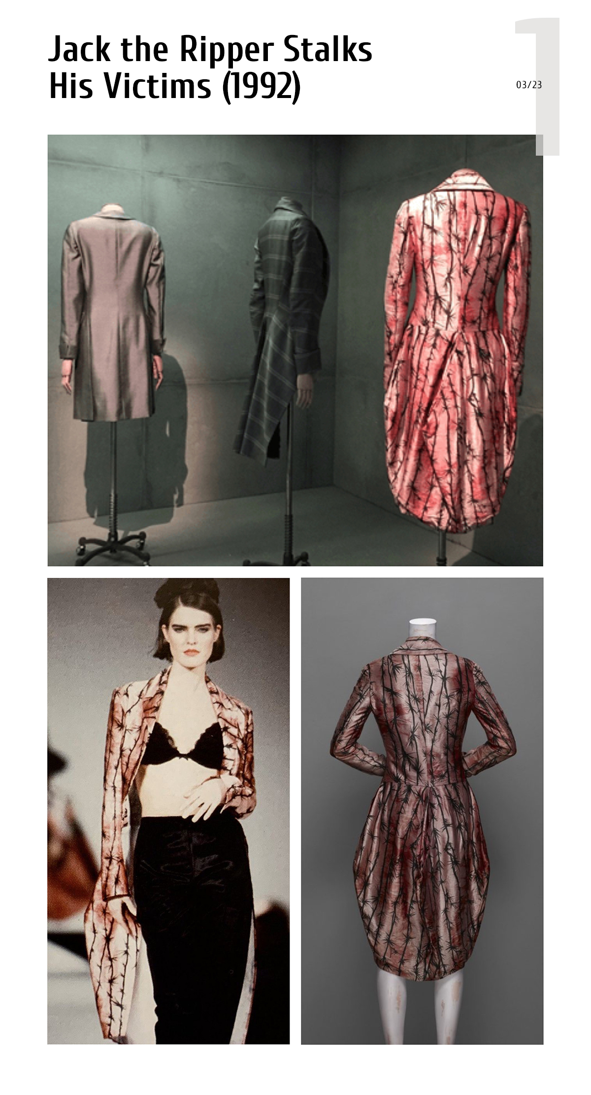 Alexander McQueen’s story started in 1992, from the “Jack the Ripper Stalks His Victims” collection, which was his graduation project. The collection featured Victorian elements and referenced the famous serial killer story. The dresses were decorated with real human hair. Isabella Blow, the fashion headliner of the time, bought the whole collection for £5000.