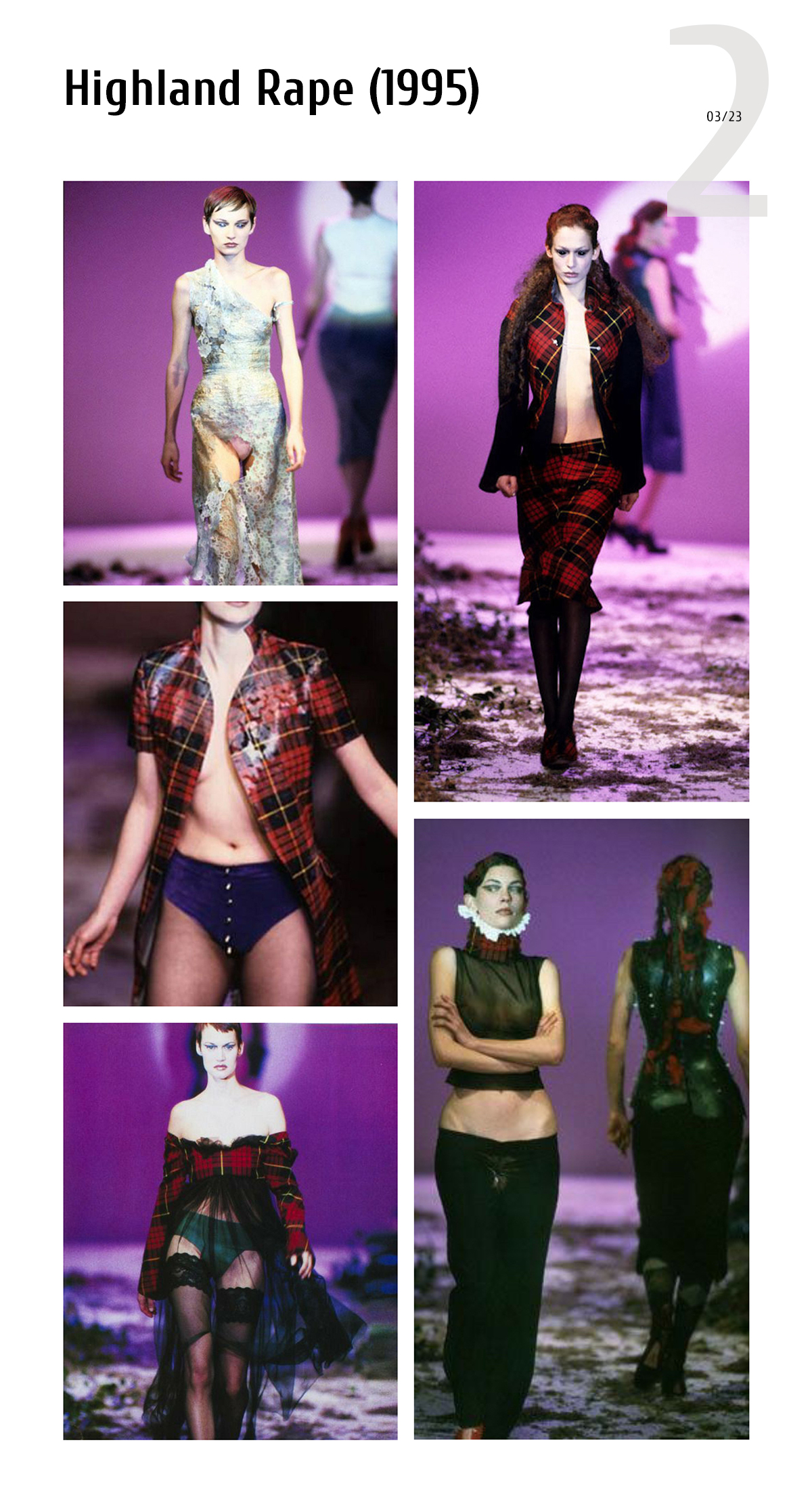 The “Highland Rape” collection of 1995 aimed to tell about the colonization and destruction of Scotland by England in the 18-19 centuries. The collection was full of controversial metaphors: it hinted at England’s tyranny, xenophobic attitude towards the Scottish people, and killing of innocent people. It also was very personal and grew from the designer’s trauma – Alexander McQueen suffered abuse in his childhood.