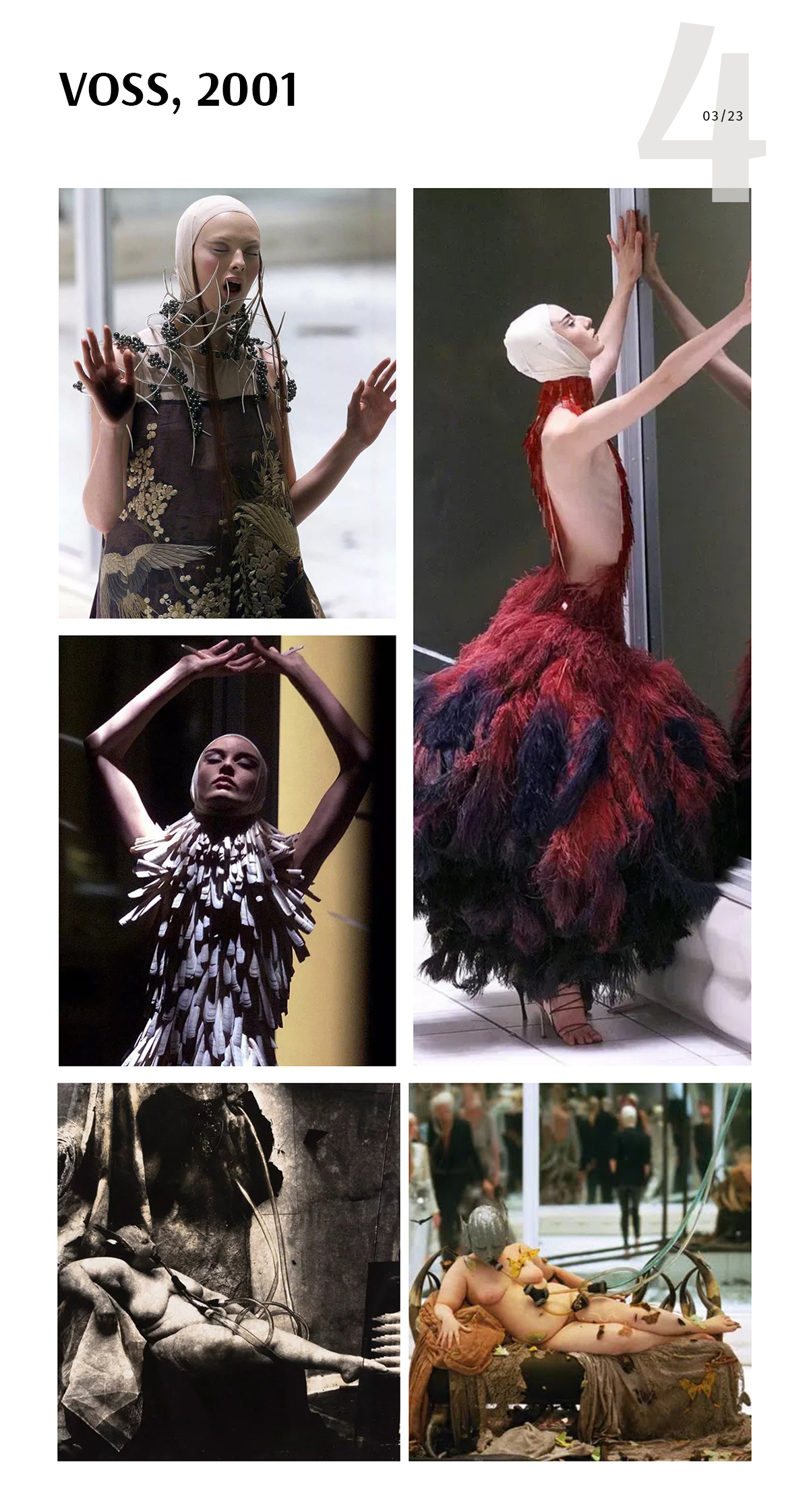 The “VOSS” show of 2001 was a big experiment on the audience who was presented with a mirror cube before the show. The start of the show was purposefully delayed, resulting in guests staring at their own reflections for almost an hour. Many of them admitted that it was very uncomfortable. The models were behind the mirror walls and couldn’t see the audience. Their only assignment was to act like inmates of a mental asylum. Inside the room, there was one more mirror cube that opened at the conclusion of the show and revealed a close recreation of Joel Peter Witkin’s Sanitarium (1983). The performance aimed to reference the biggest fear of the fashion industry – being overweight.