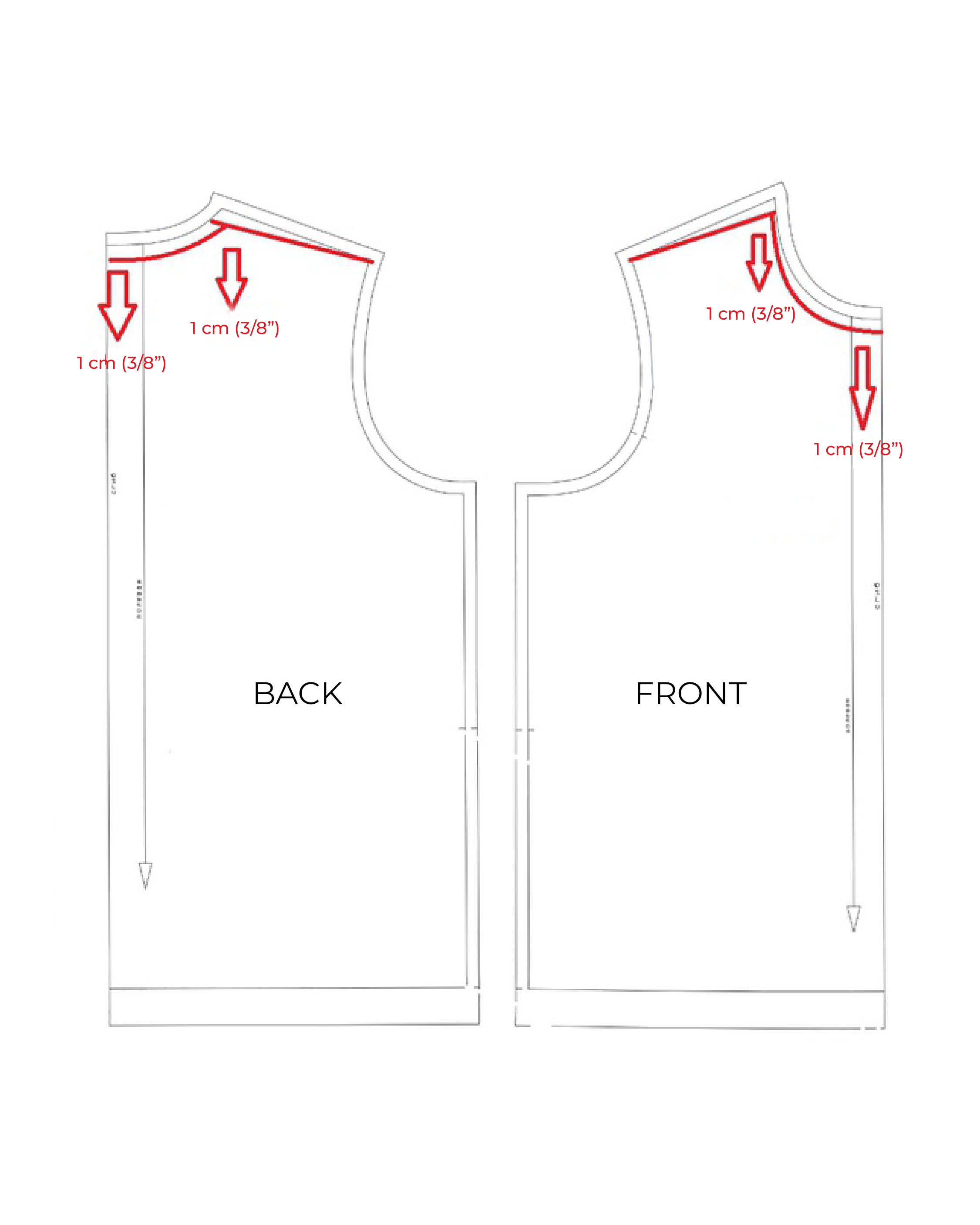 - Suggested making the shoulder seam longer and changing its angle – lifting the angle as if the adjustments were made to fit straight shoulders;