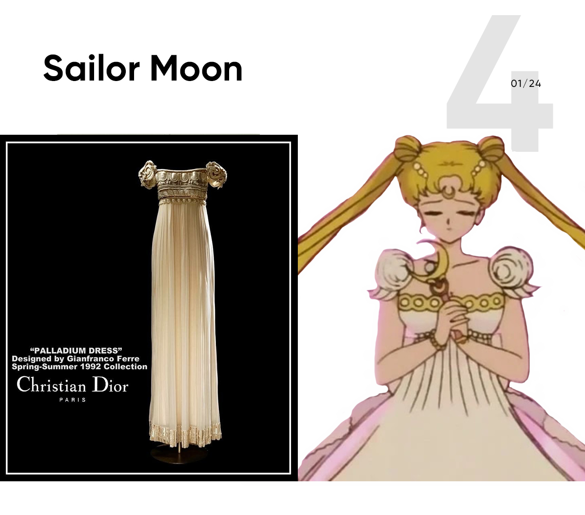 Sailor Moon is another anime character adored by the fashion industry. Jimmy Choo collaborated with the legendary animation and released shoes and accessories inspired by Sailor Moon. By the way, the anime characters actually loved to wear designer clothes themselves – the series creator took a lot of ideas from real-world fashion collections. For example, Serenity’s dress is basically the dress from Dior 1992. Other garments also refer to creations of Chanel and Saint Laurent.