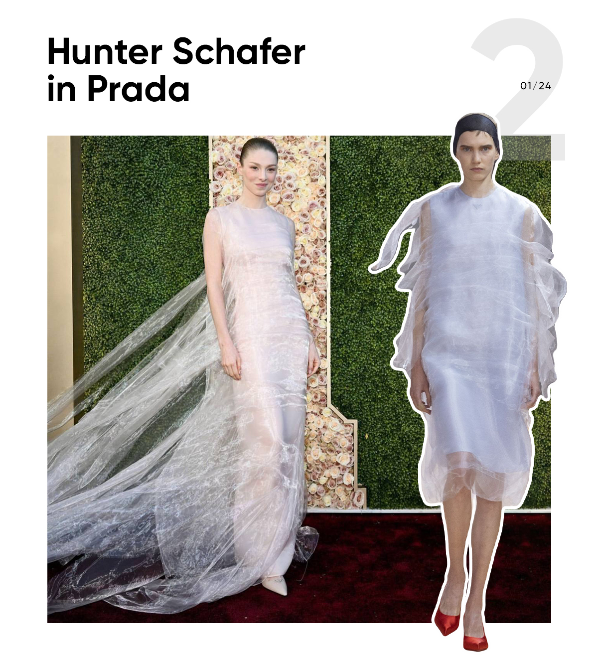 Hunter Schafer appeared in the main it-dress from the last Prada collection. It was increased in length to fit the occasion’s dress code.