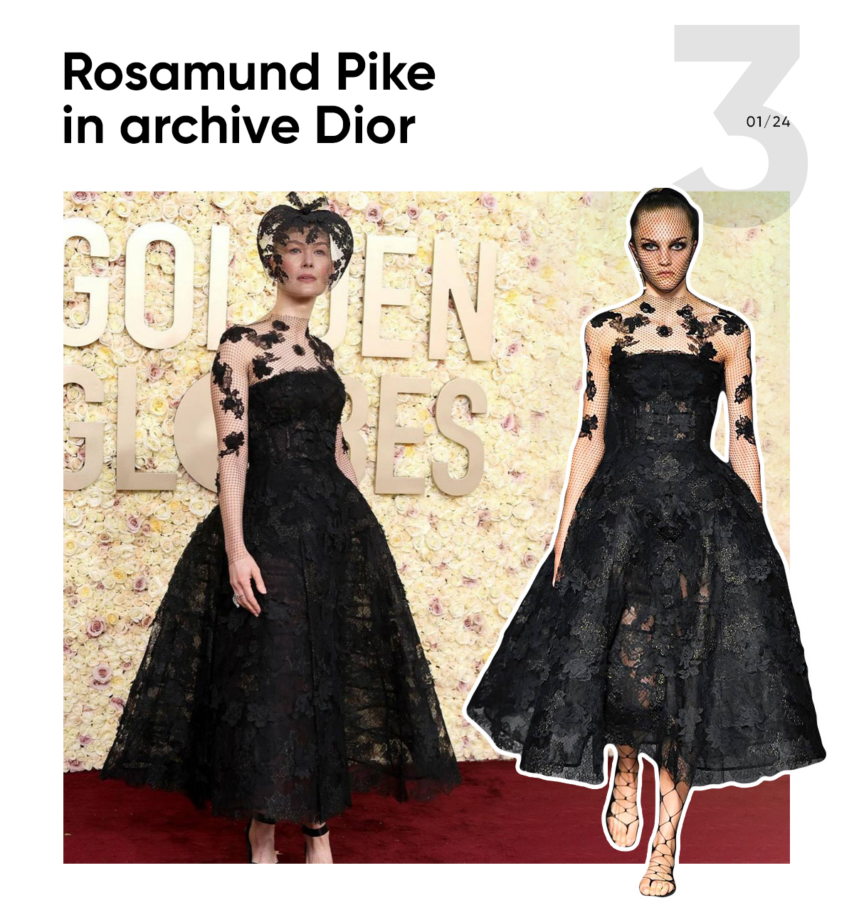 Rosamund Pike also preferred to wear an archive look to the Golden Globes red carpet. She chose a couture 2019 look by Dior. Though it wasn’t the most spectacular look of the night, it sure was interesting and beautiful.