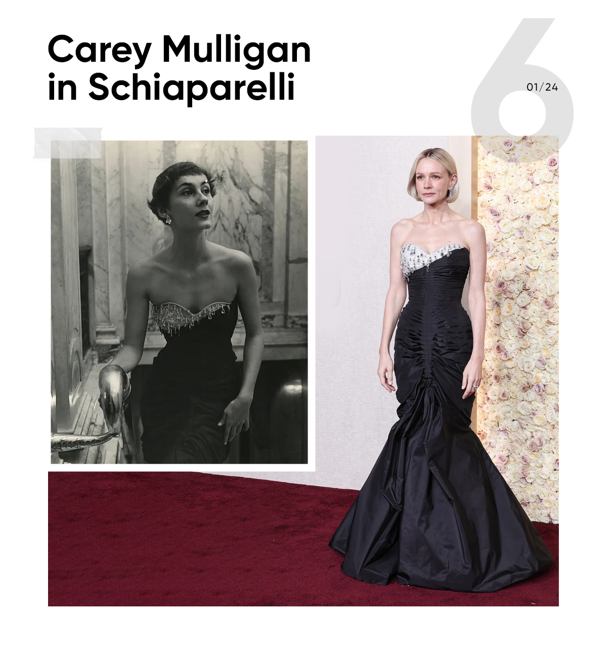 Carey Mulligan also appeared in Schiaparelli. She wore a custom look by creative director Daniel Roseberry – the designer created a copy of the 1949 Schiaparelli dress.