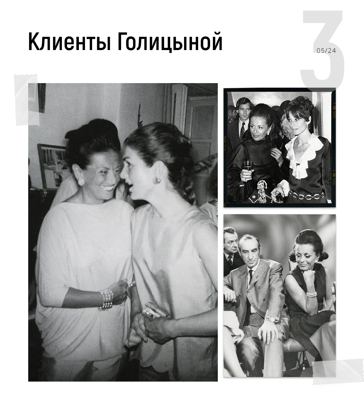 Клиентами Голицыной были культовые личности того времени: Софи Лорен, Одри Хепберн, Элизабет Тейлор, Грета Гарбо, Жаклин Кеннеди.