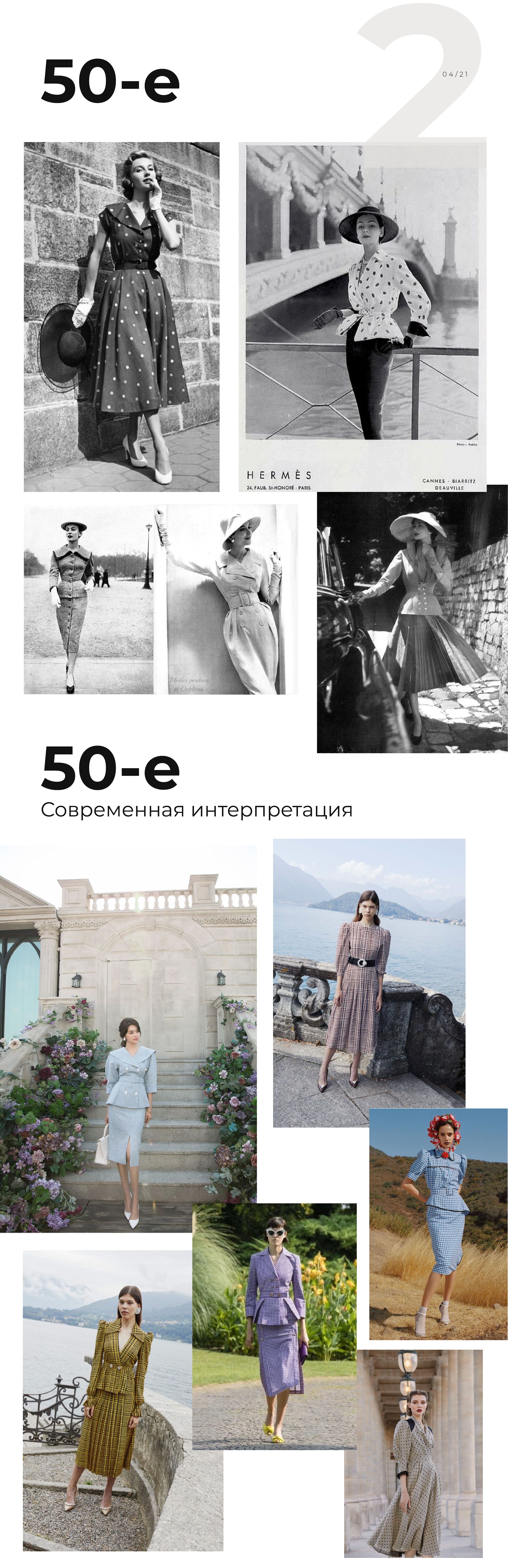 В 50-е мир отходит от ужасов войны, и в моду возвращается женственность: приталенный силуэт, декольте и вырезы (V-образный, квадратный, сердечком), рукава фонарики, акцент на талию, стиль выпускников колледжа — преппи (стилизации школьной формы престижных учебных заведений), бермуды, бомберы и косухи.