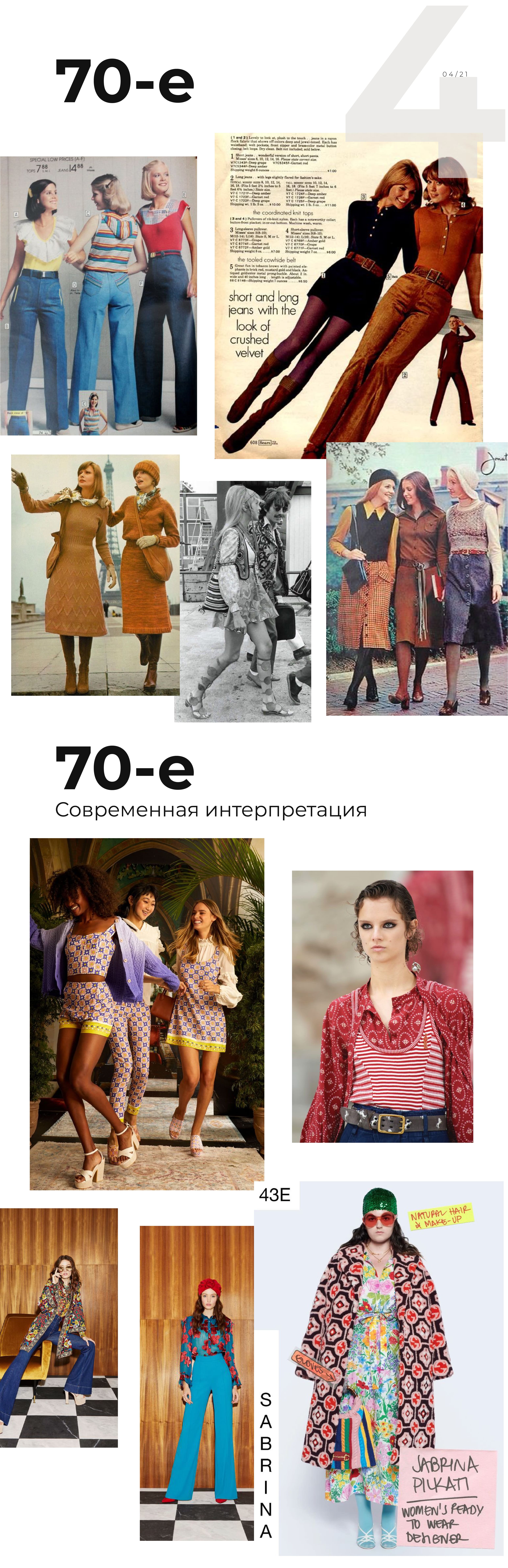 70-е — это микс стилей. Он и сейчас на самом пике популярности. Чтобы погрузиться в атмосферу, посмотрите ролики Gucci. К этому периоду относятся бохо и этника, бельевой и спортивный стили, унисекс и сафари.
