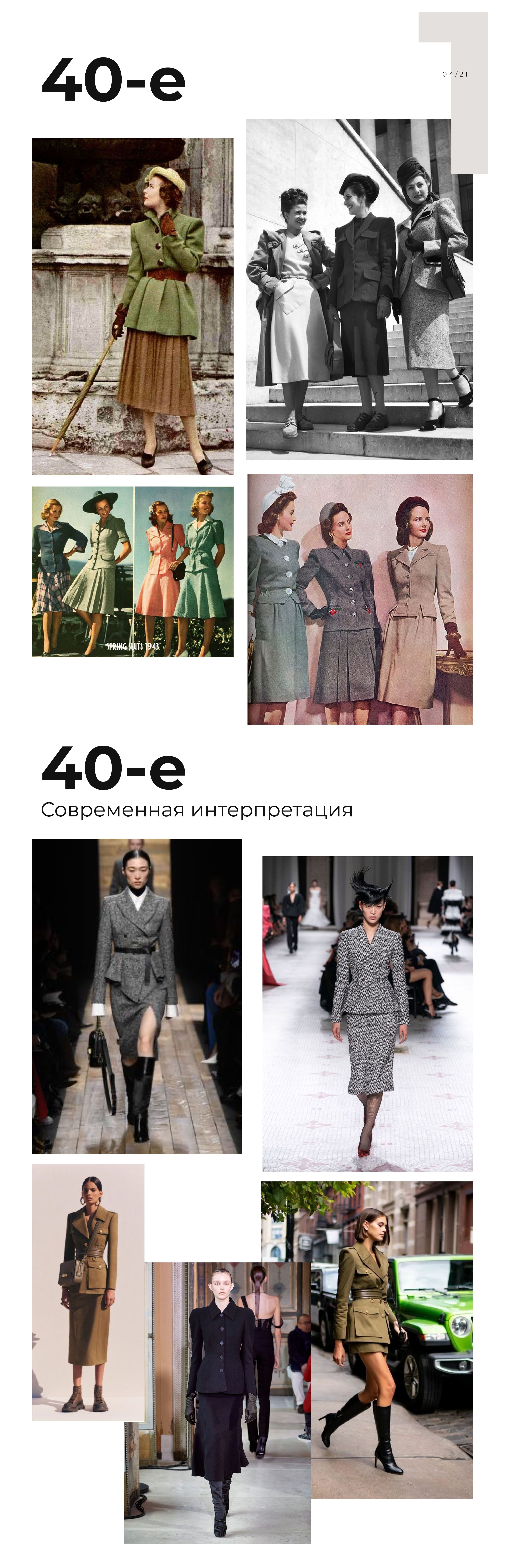 40-е — это мотивы стиля милитари: жакеты с квадратными плечами и подплечниками, ремни, накладные карманы. А также мелкий цветочный принт.