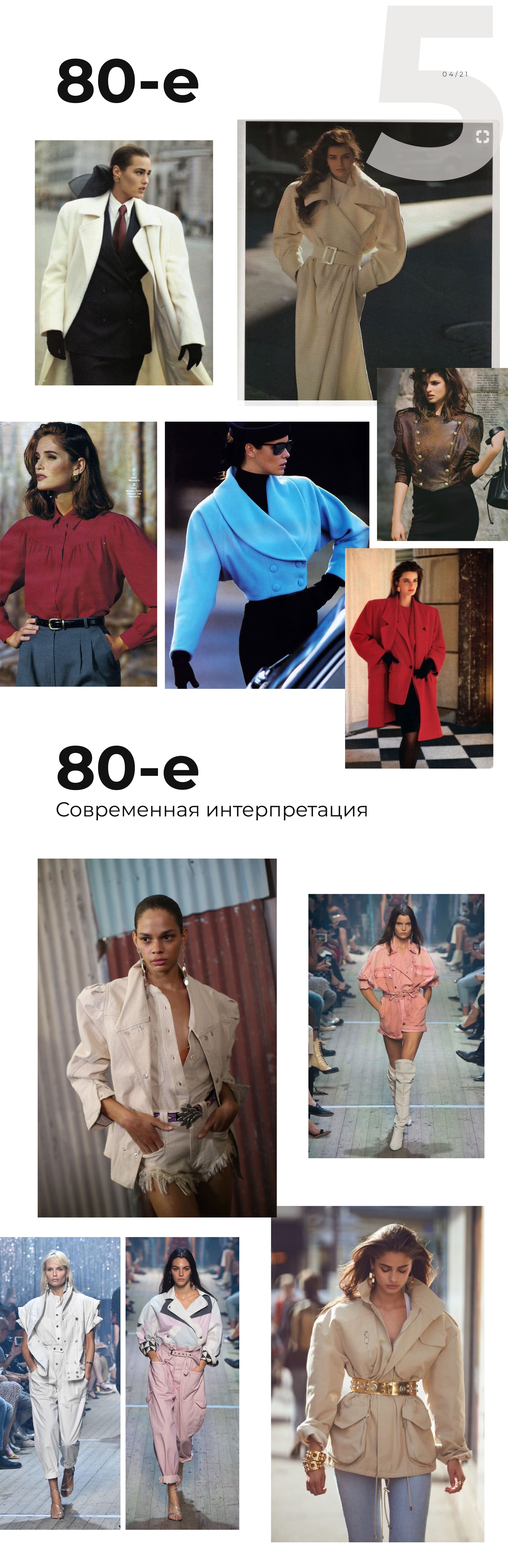 80-е — объемные рукава, широкие плечи, корсеты, декольте, женственные блузки и акцент на талию за счет явного контраста с плечами и бедрами. Яркие цвета и сочетания колор-блок — тоже фишки этого десятилетия.