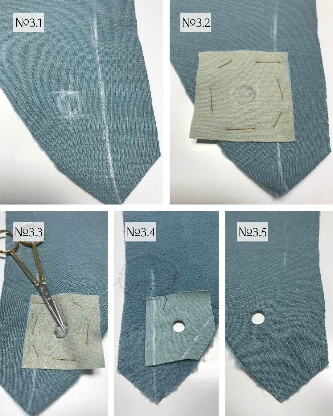 2. Заготовьте обтачку: вырежьте из кулирки и продублируйте квадрат ~3,5 см, в центре которого разметьте петлю. Приложите обтачку лицевой стороной к лицевой стороне изделия, совмещая разметку петель. Проложите строчку с длиной стежка 2 мм по намеченному контуру петли.