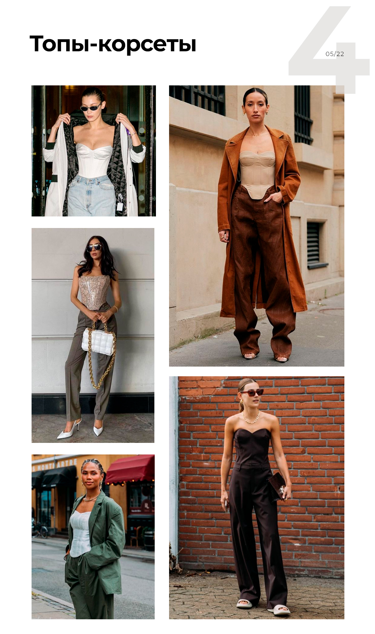 Топы-корсеты — тоже тренд. Они идеальны с широкими джинсами, свободными брюками или брюками карго в стиле нулевых. И, кстати, прекрасно смотрятся с заниженной посадкой.