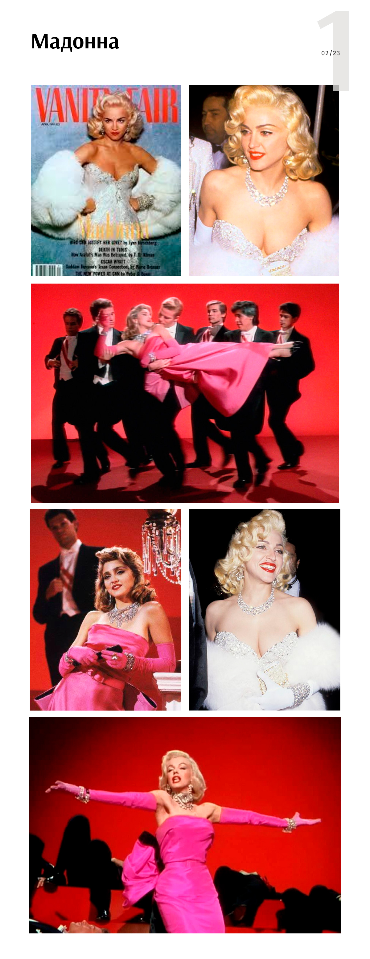 Мадонна перевоплощалась в Монро не один раз. В период активного роста карьеры в основе стиля певицы всегда лежал образ Мэрилин. Впервые она использовала его в клипе Material girl в 1984 году — оммаже на фильм «Джентльмены предпочитают блондинок». Видео стало настолько популярным, что по факту определило внешний вид артистки. К слову, этот клип — отличный пример того, как удачно можно соединить исходник с современностью — 80-ми на тот момент.