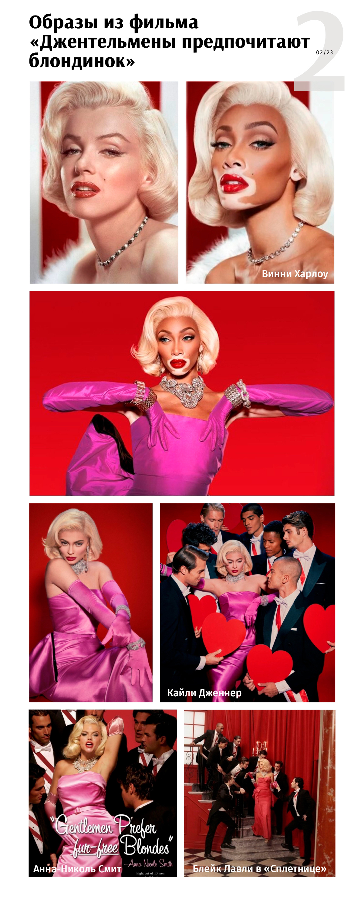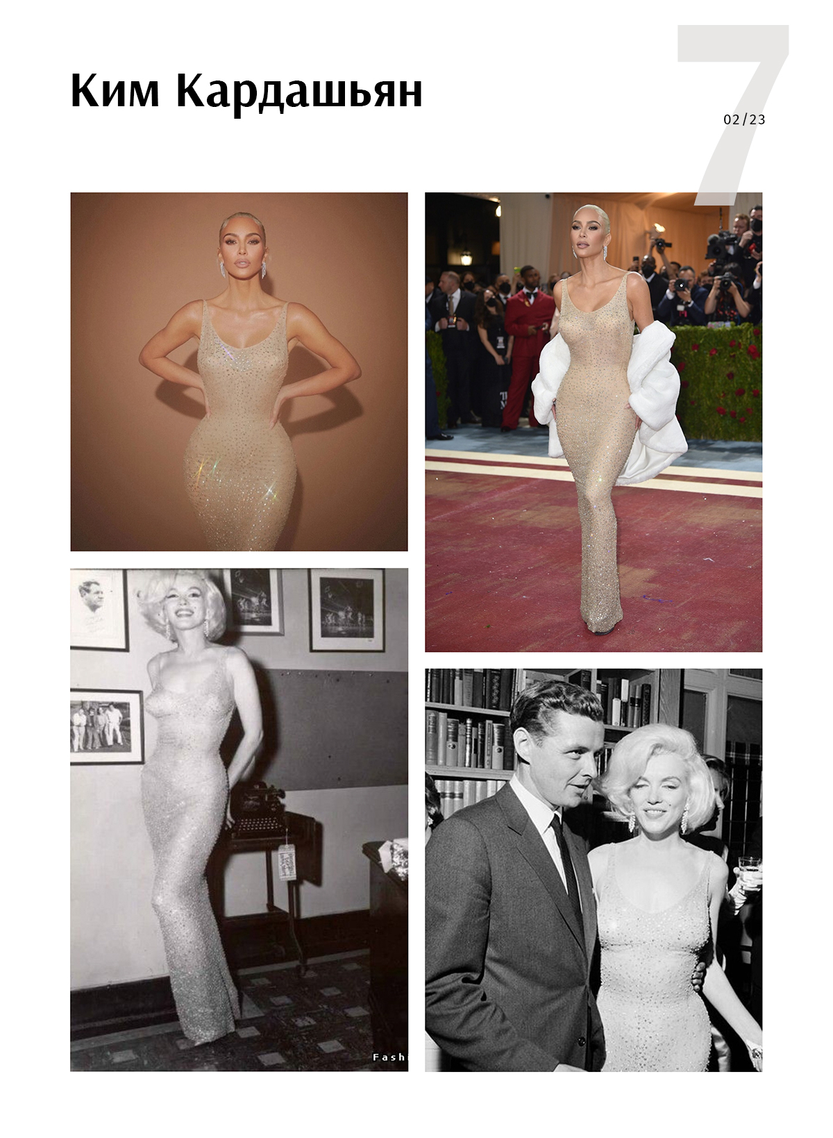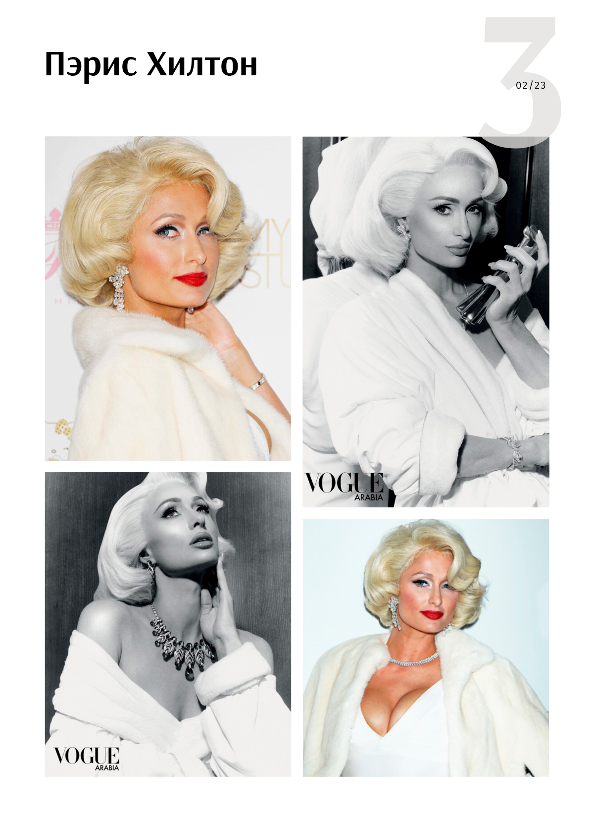 Самая известная блондинка 2000-х — Пэрис Хилтон — никак не могла пройти мимо образа Монро и не раз его примеряла. Последнее появление было совсем недавно, уже в 2023-м, для съемки Vogue Arabia.