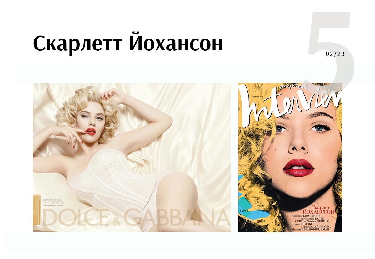 Образ Монро часто используют в рекламных кампаниях. Например, Dolce&Gabbana выпускали рекламу со Скарлетт Йоханссон в образе голливудской дивы. А еще она была на обложке русского Interview — реверанс самой известной работе Энди Уорхола с Мэрилин.