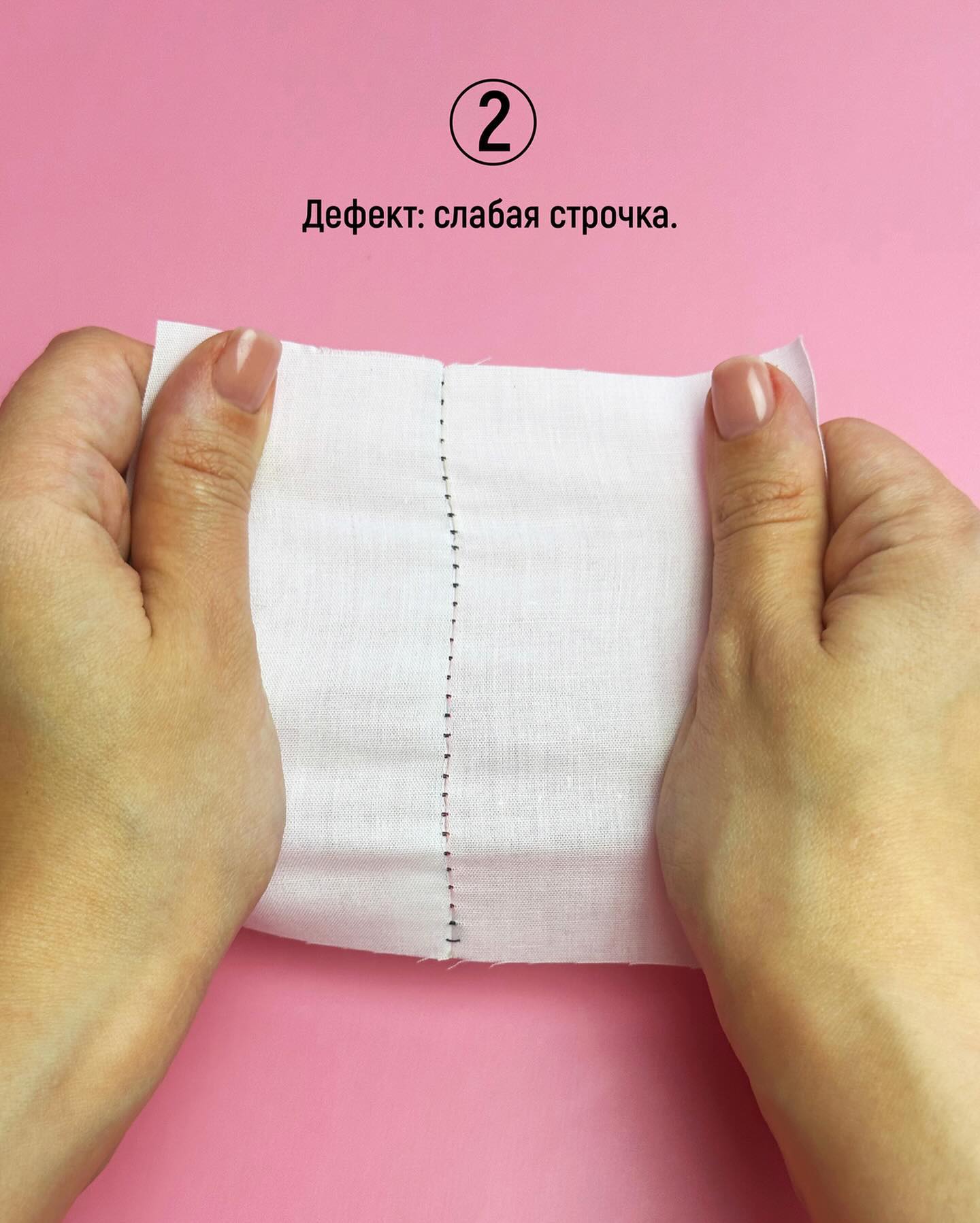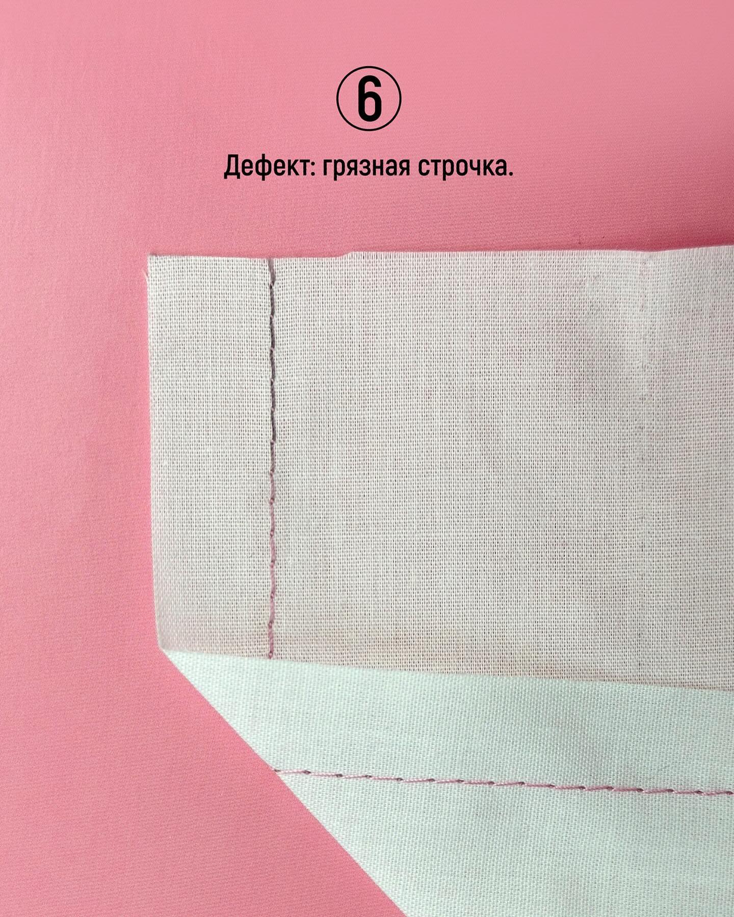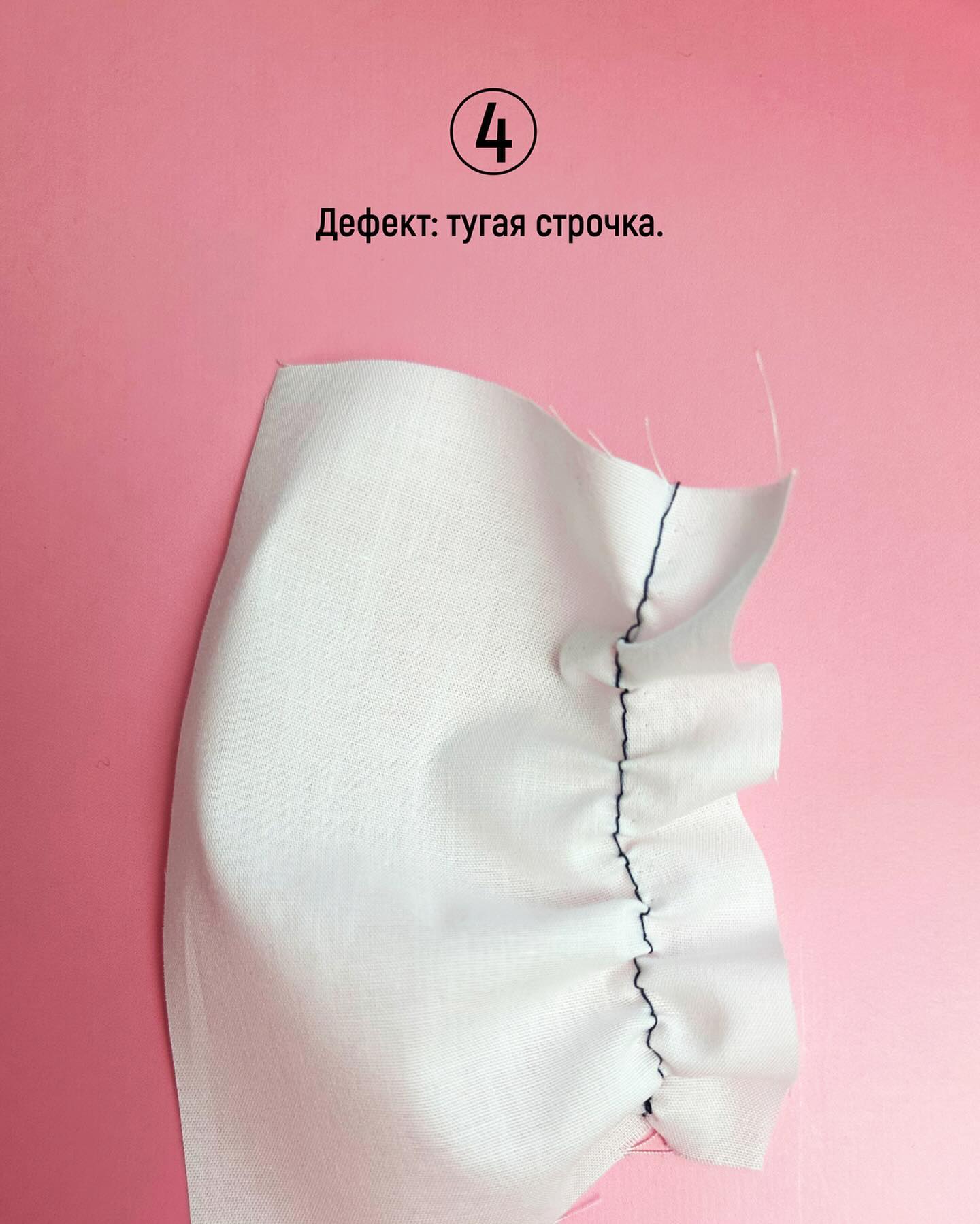 Здесь наоборот — нитки слишком натянуты. Ослабьте натяжение с помощью колеса. Чаще всего этот дефект проявляется на легких и тонких тканях.