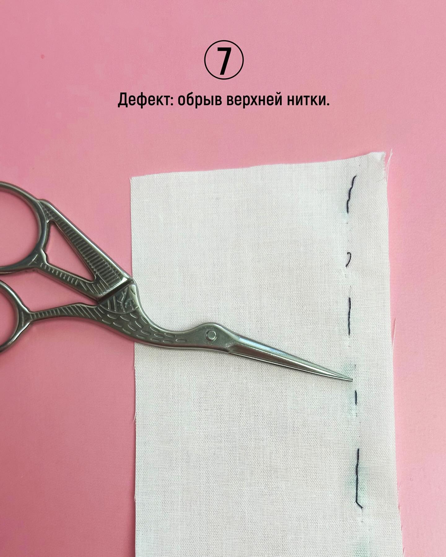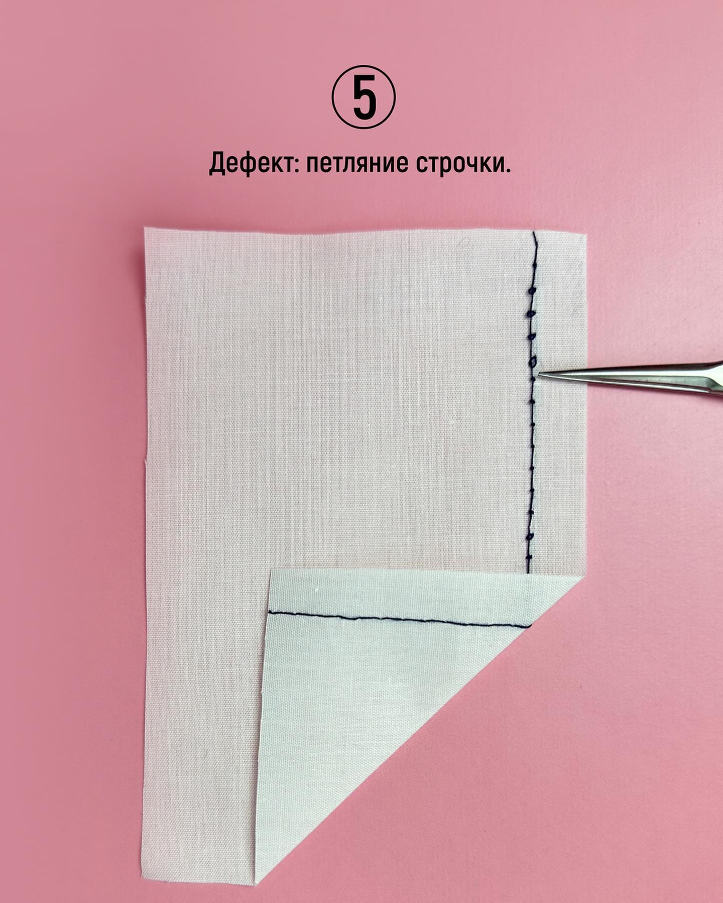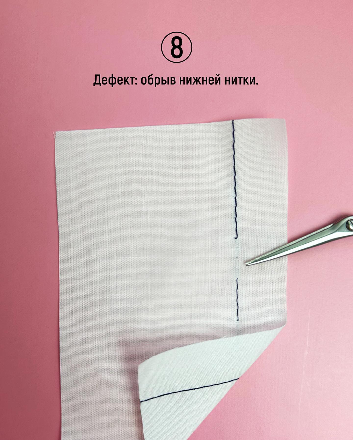 Здесь наоборот — нитки слишком натянуты. Ослабьте натяжение с помощью колеса. Чаще всего этот дефект проявляется на легких и тонких тканях.