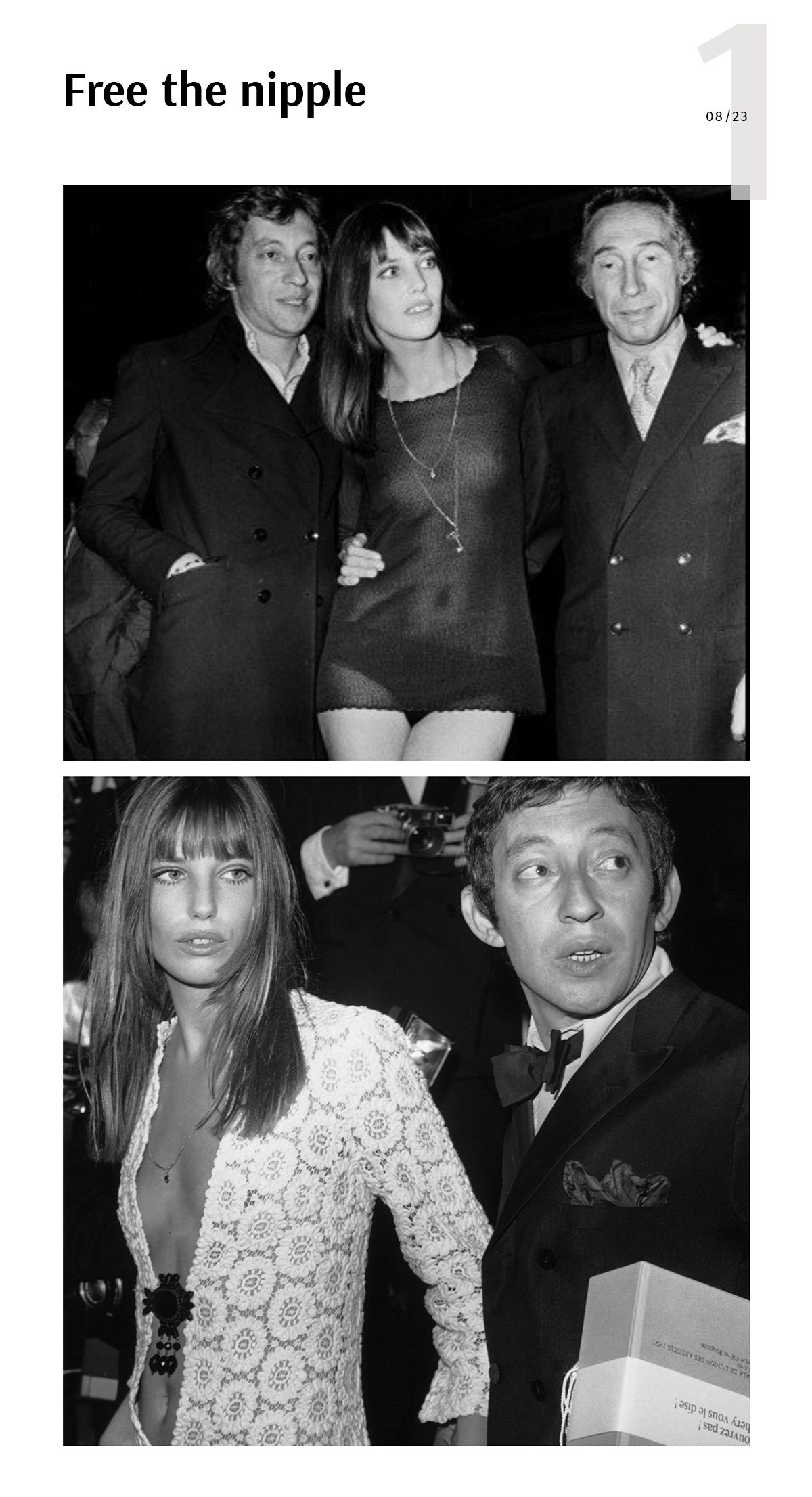 Конечно, официально в 60-е феминистического движения с лозунгом Free the nipple не существовало, но Биркин всегда опережала время. С английского эти слова буквально означают «освободи сосок». Образ актрисы на премьере фильма «Слоган» в 1969 году навсегда вошел в историю моды. Она была одета в прозрачное мини, надетое на голую грудь, и маленькие трусики. Ее пример помог обществу более свободно взглянуть на не затянутую в бюстгальтер женскую грудь.