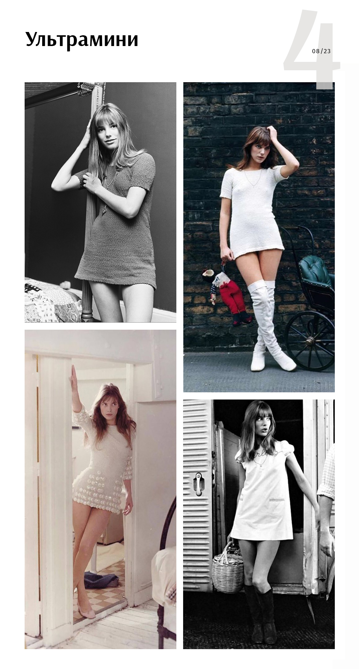 Биркин много работала в Париже, но была родом из свингующего Лондона, а поэтому привезла с собой моду на ультракороткие платья. Она ловко балансировала на грани между сексуальностью и вульгарностью: с мини выбирала закрытый верх без декольте и обувь на плоском ходу.