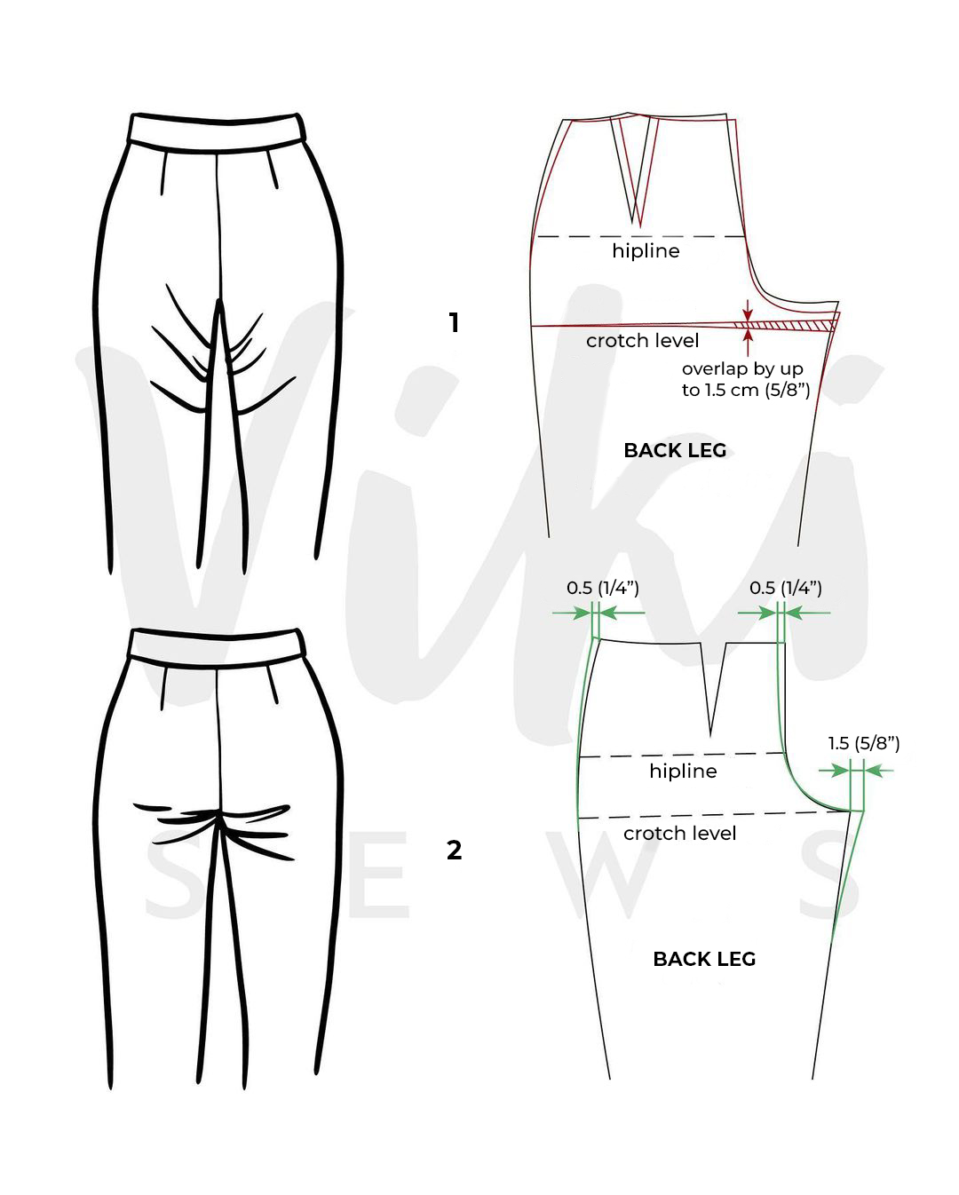To fix this issue, you will need to make the back leg wider at the crotch point level (by up to 1.5 cm [5/8”]), move the crotch seam by 0.5 cm (1/4”), and add the same number to the side seam.