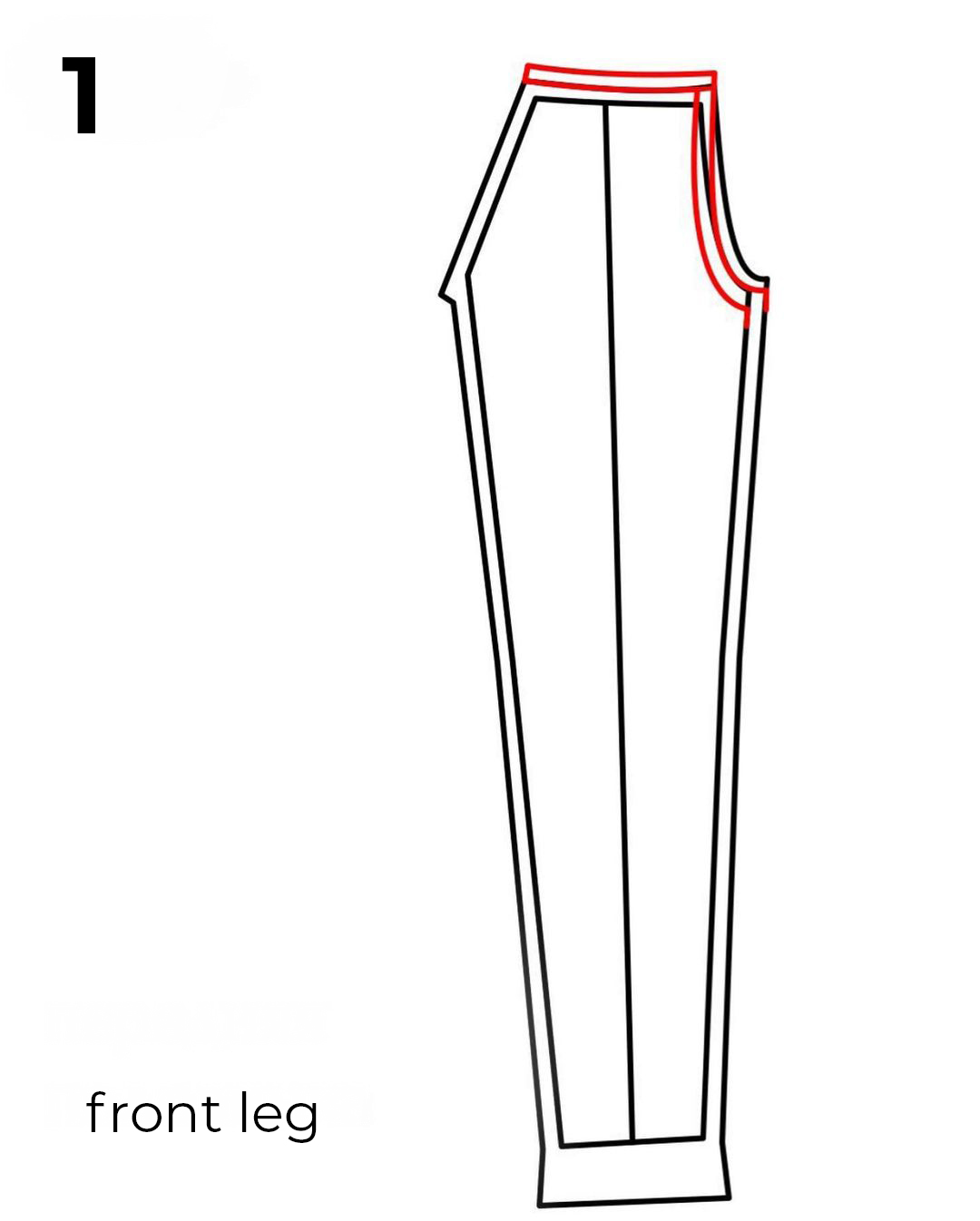 - Raise the upper edge of the front trouser leg, pocket, and pocket facing by 0.5 cm (1/4”). Draw a smooth line that will be your new front upper edge.