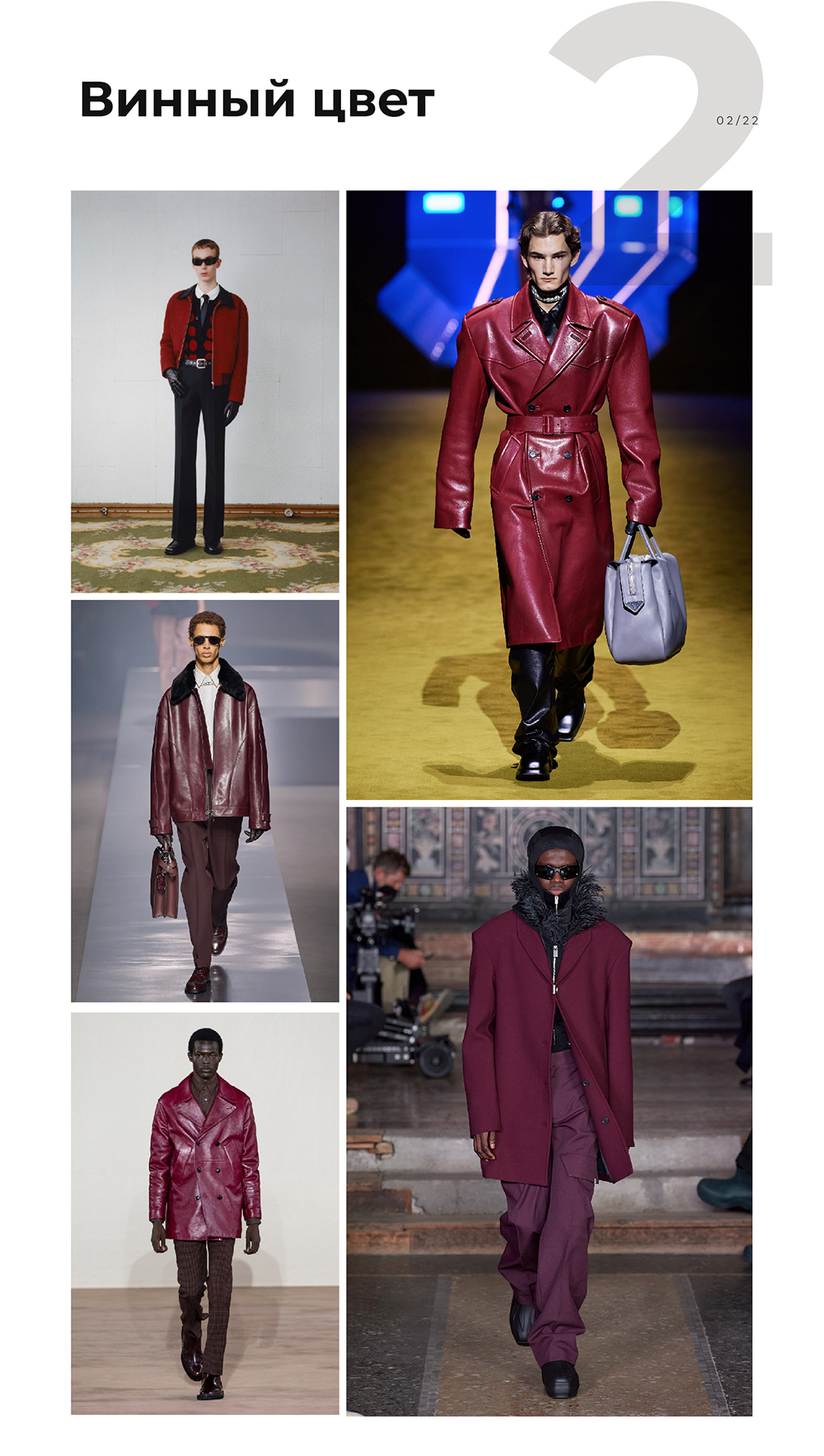Гардероб мужчины давно не состоит только из суровых, одинаково черных вещей, хотя в целом они все-таки предпочитают спокойные, базовые оттенки и ахроматы. В этом сезоне дизайнеры предлагают разнообразить гамму благородным винным цветом — в коллекциях модных домов в нем были изделия из кожи, костюмы, пальто.