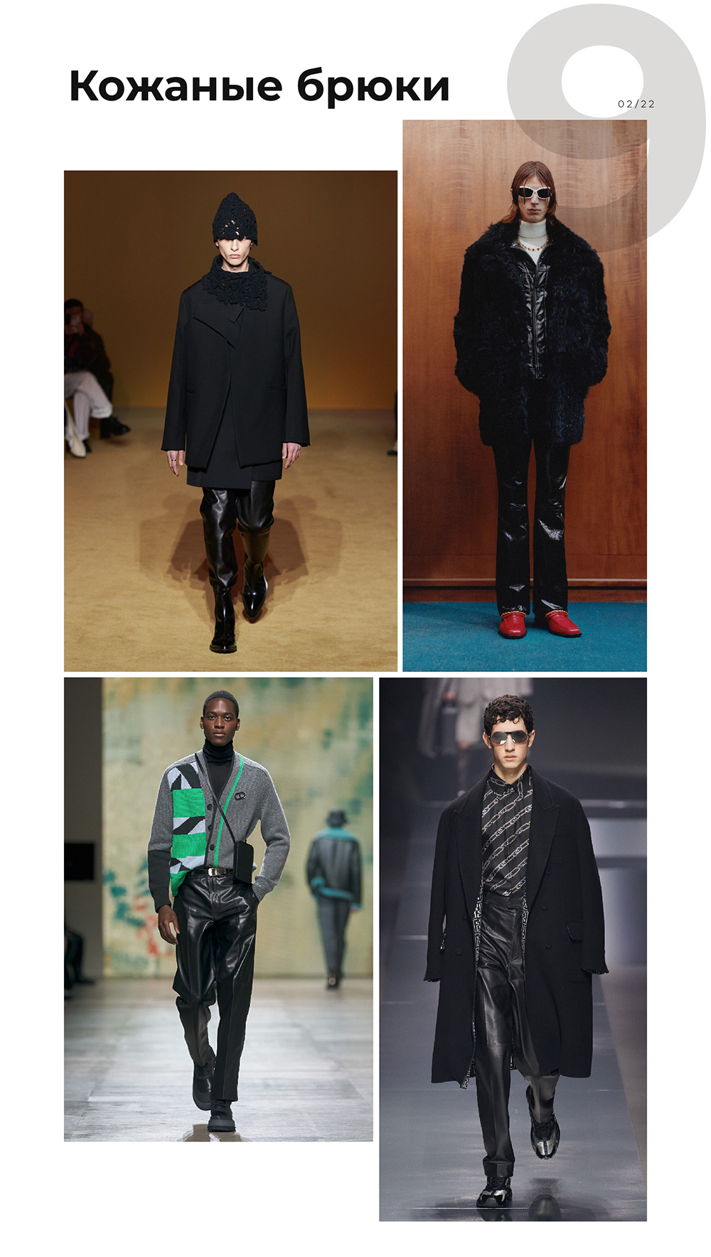 Кожа — трендовый и сложный материал. Он делает образы более фактурными, и мужчины, конечно, тоже могут его носить. Брюки, как вы помните, все равно должны быть свободными.