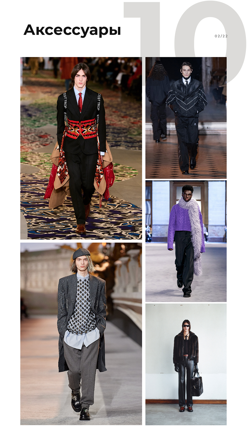 Основные аксессуары для мужчин на этот сезон: береты, галстуки, меховые шарфы и баффы. Бафф — это такой шарф-труба, который часто носят любители активного спорта.