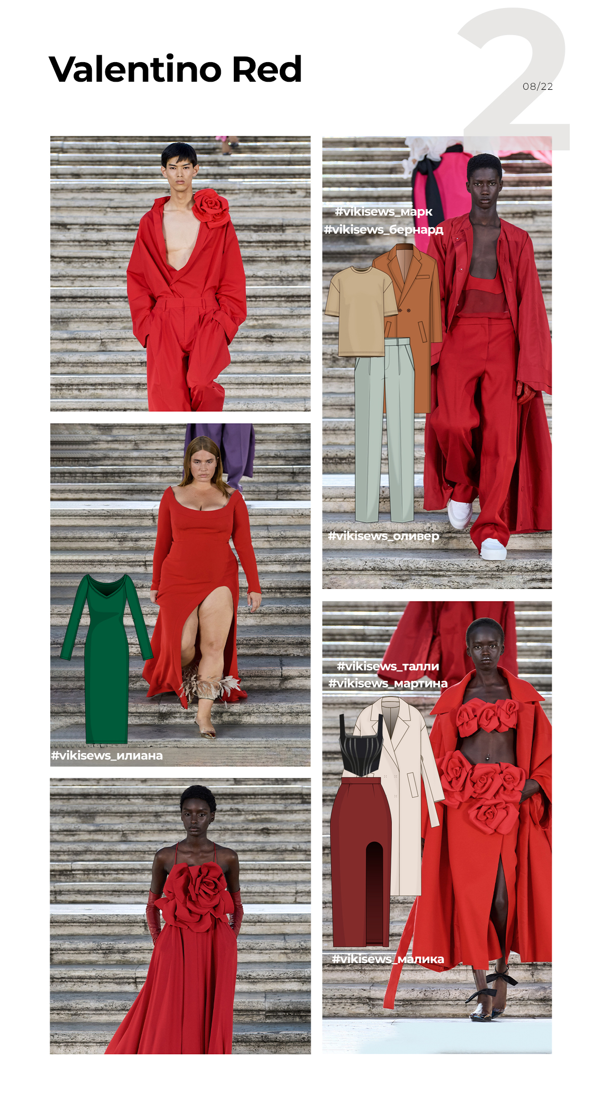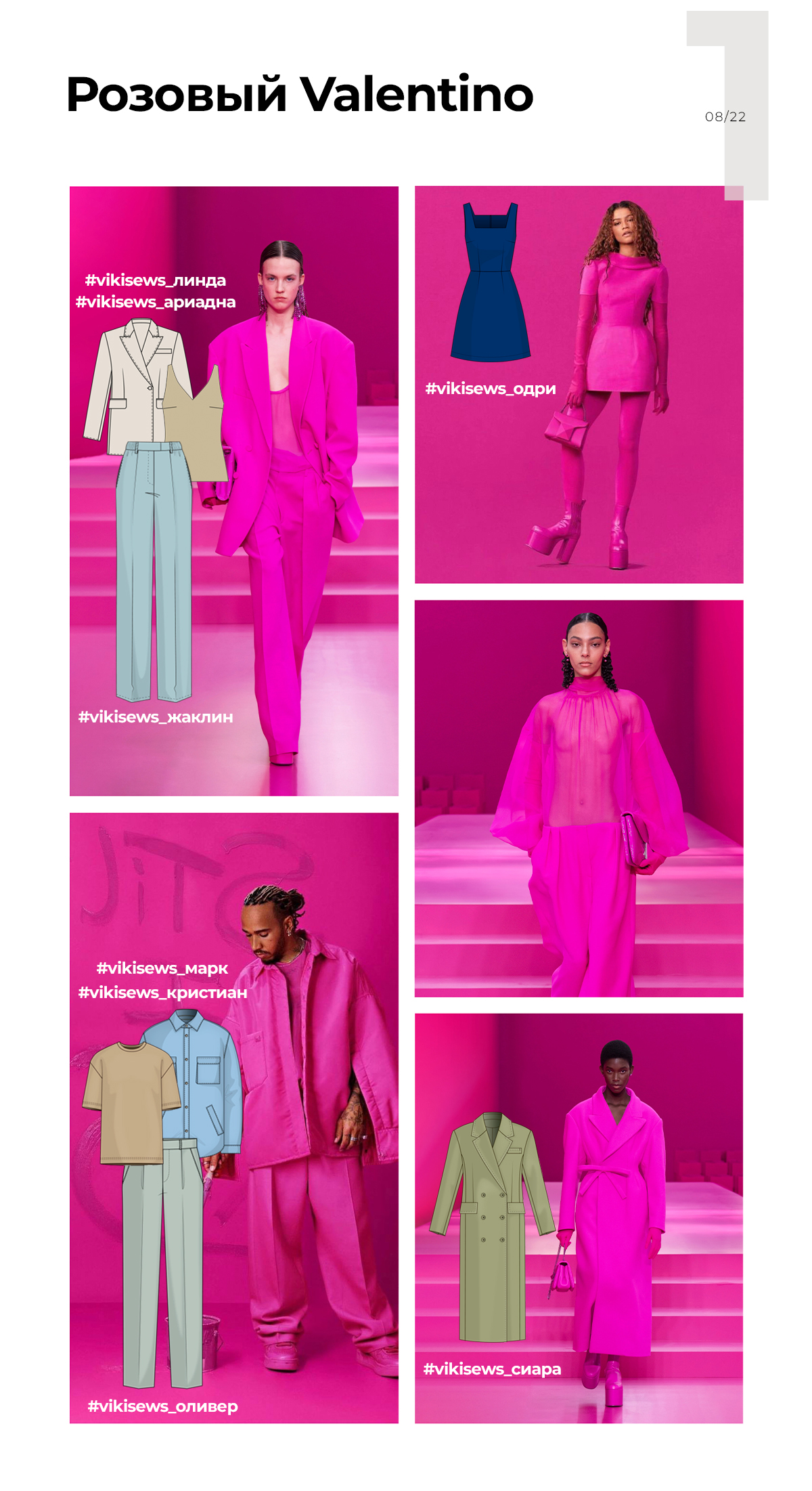 Готовые выкройки Vikisews, которые передают настроение: платье Одри, куртка Кристиан, футболка Марк, брюки Оливер, жакет Ариадна, топ Линда, брюки Жаклин. Посмотрите, может, еще есть костюмная ткань в цвете фуксия.