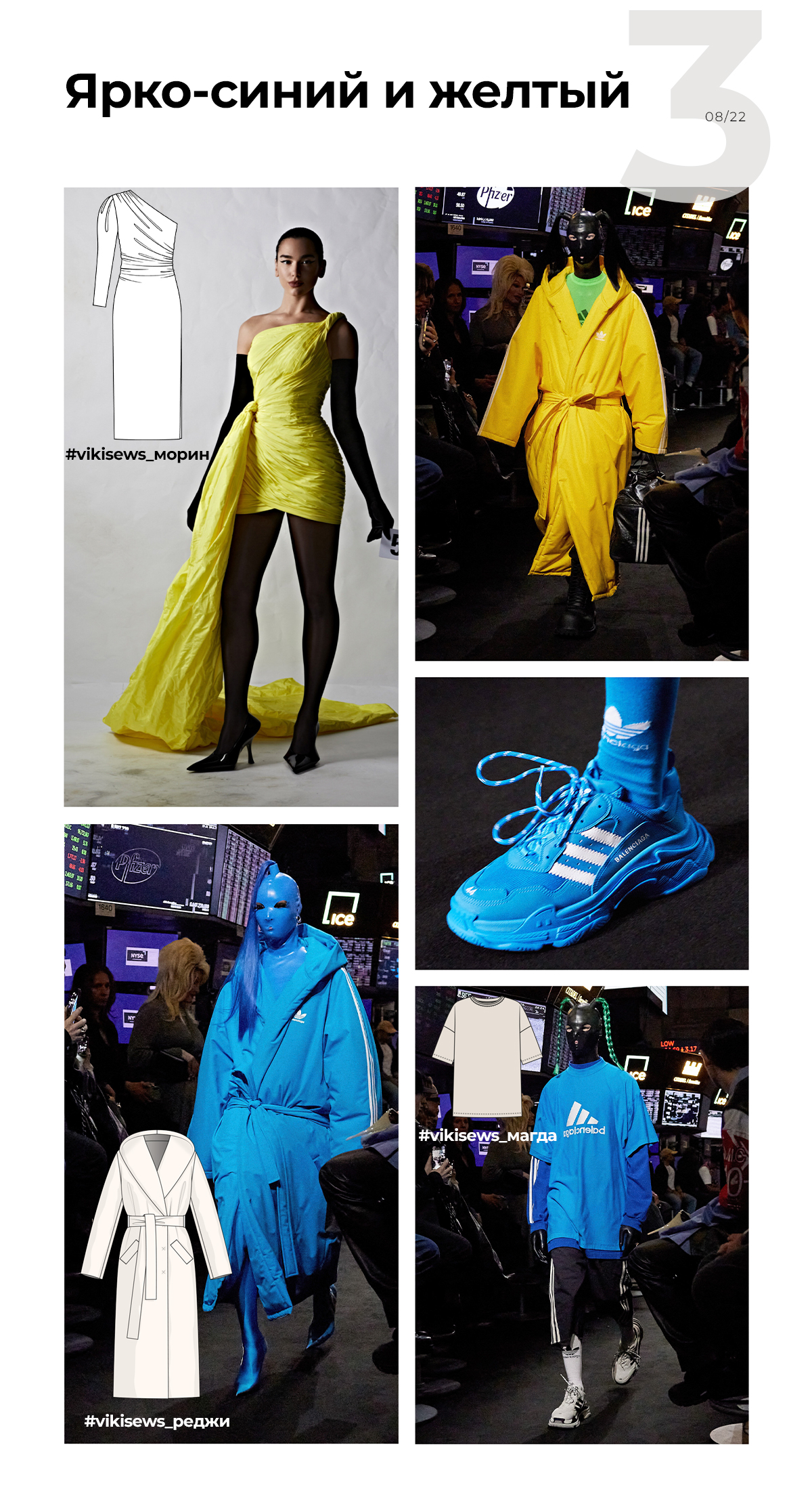 Balenciaga сделали флагманами своей коллекции ярко-синий и желтый. Вспомните коллаборацию с Adidas, где самые интересные вещи были в этих цветах. Даже культовые кроссовки Triple S.