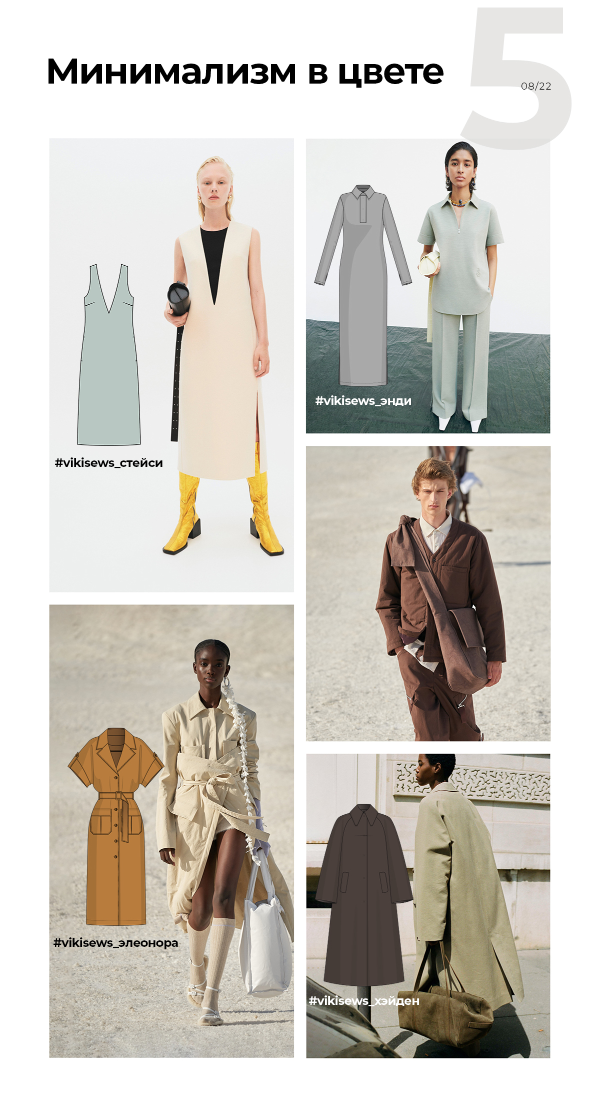 Выкройки, которые передают настроение: юбка Малика, топ Талли, пальто Мартина, платье Илиана, футболка Марк, брюки Оливер, пальто Бернард.
