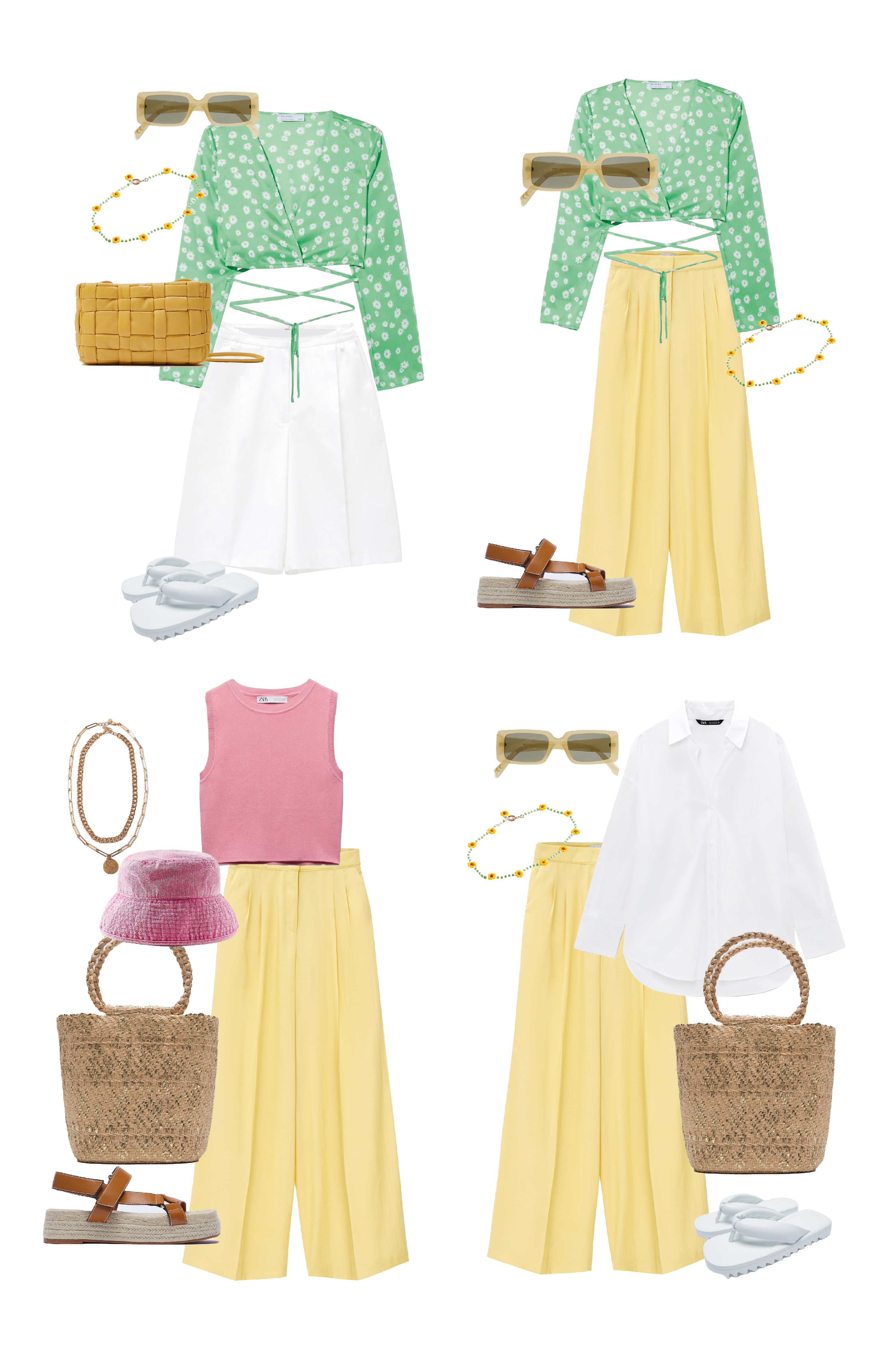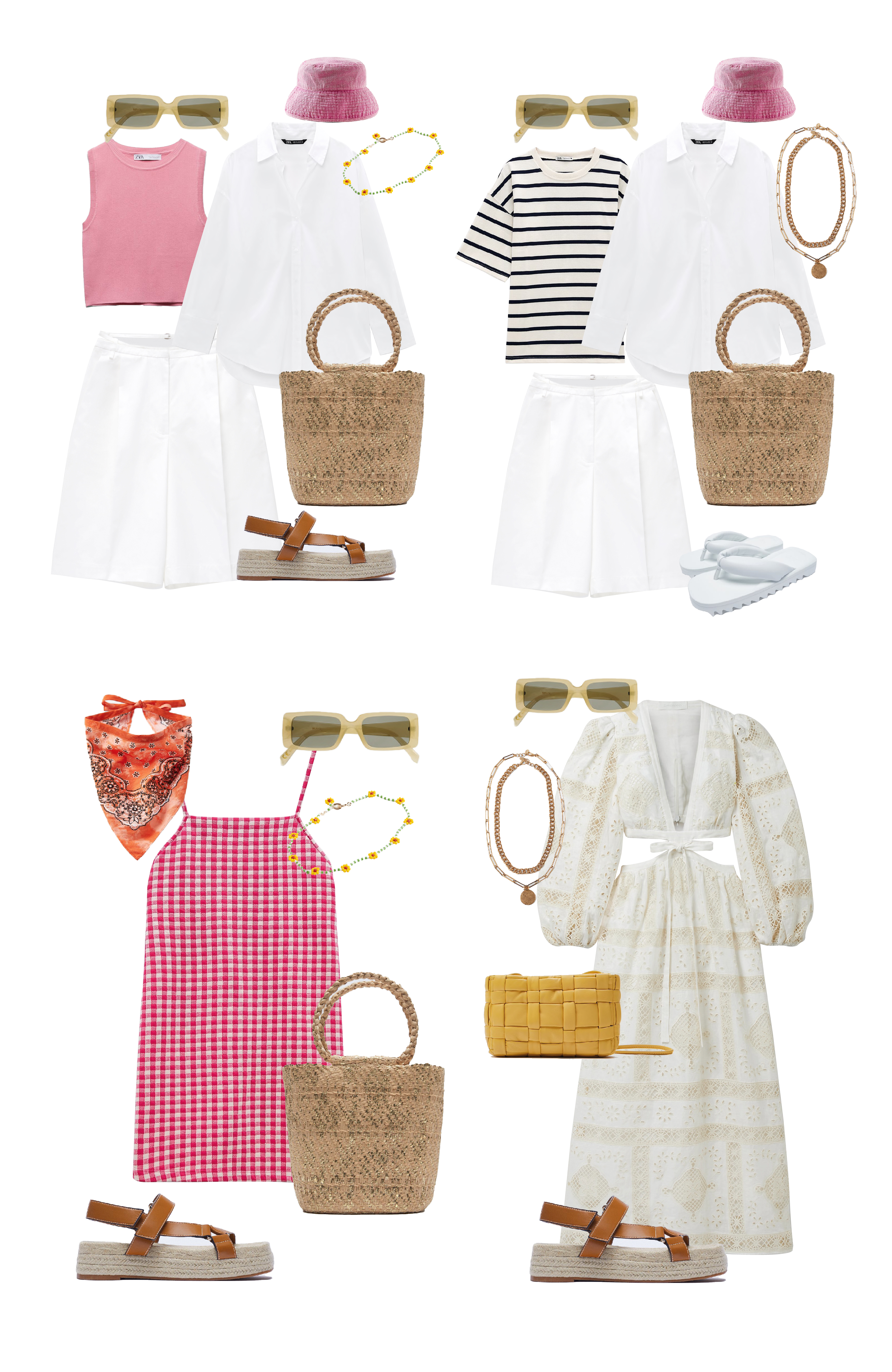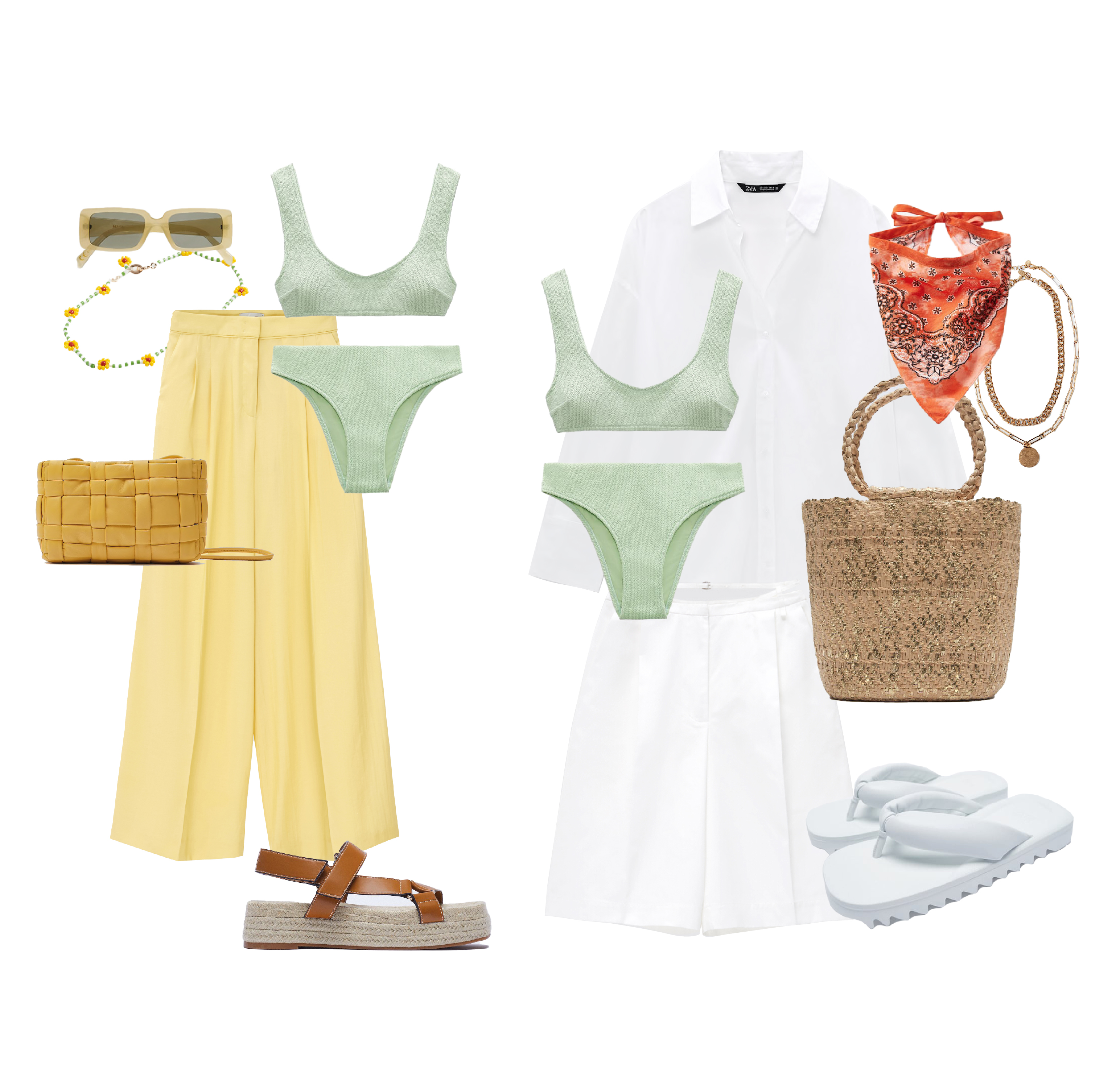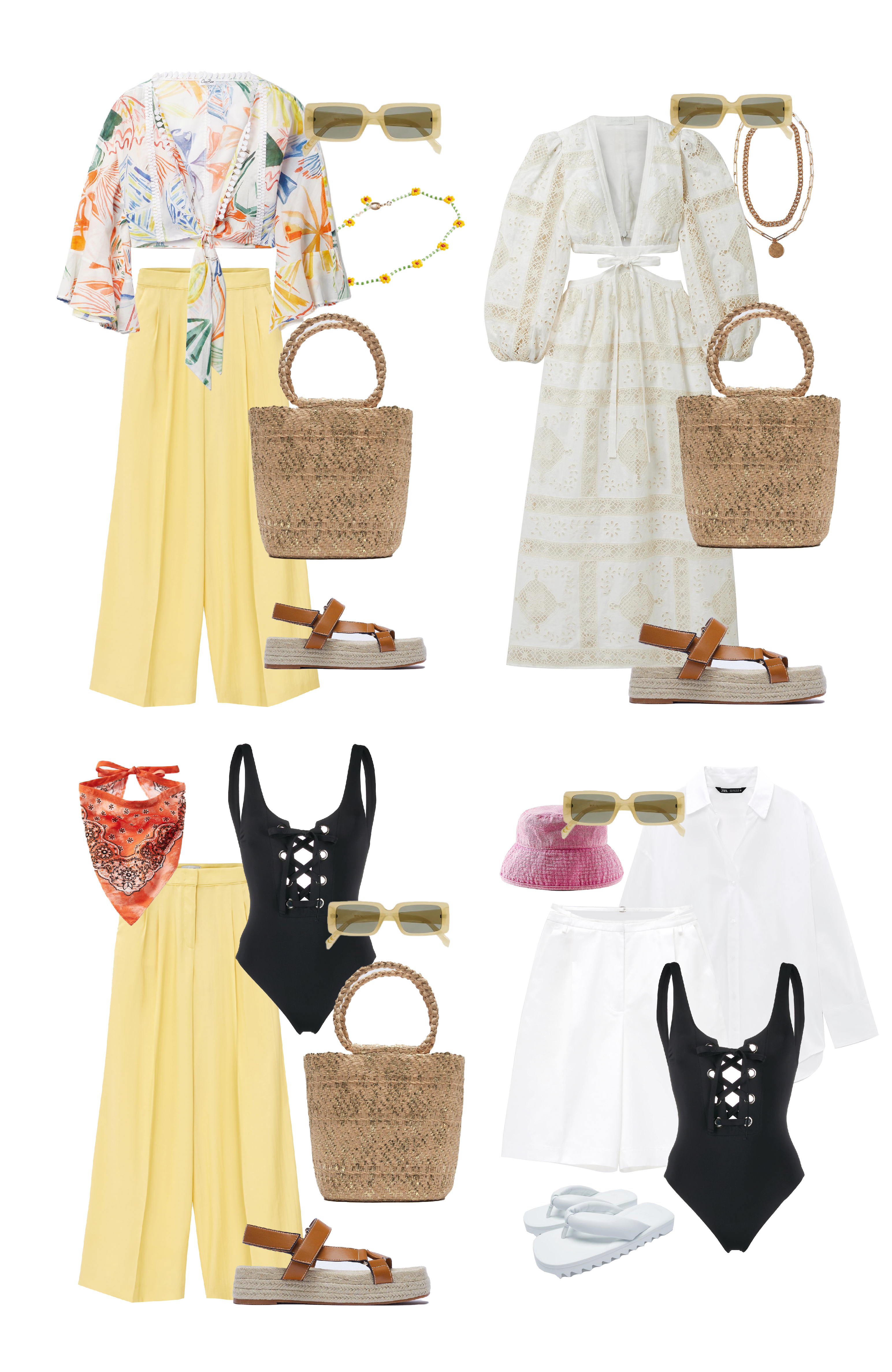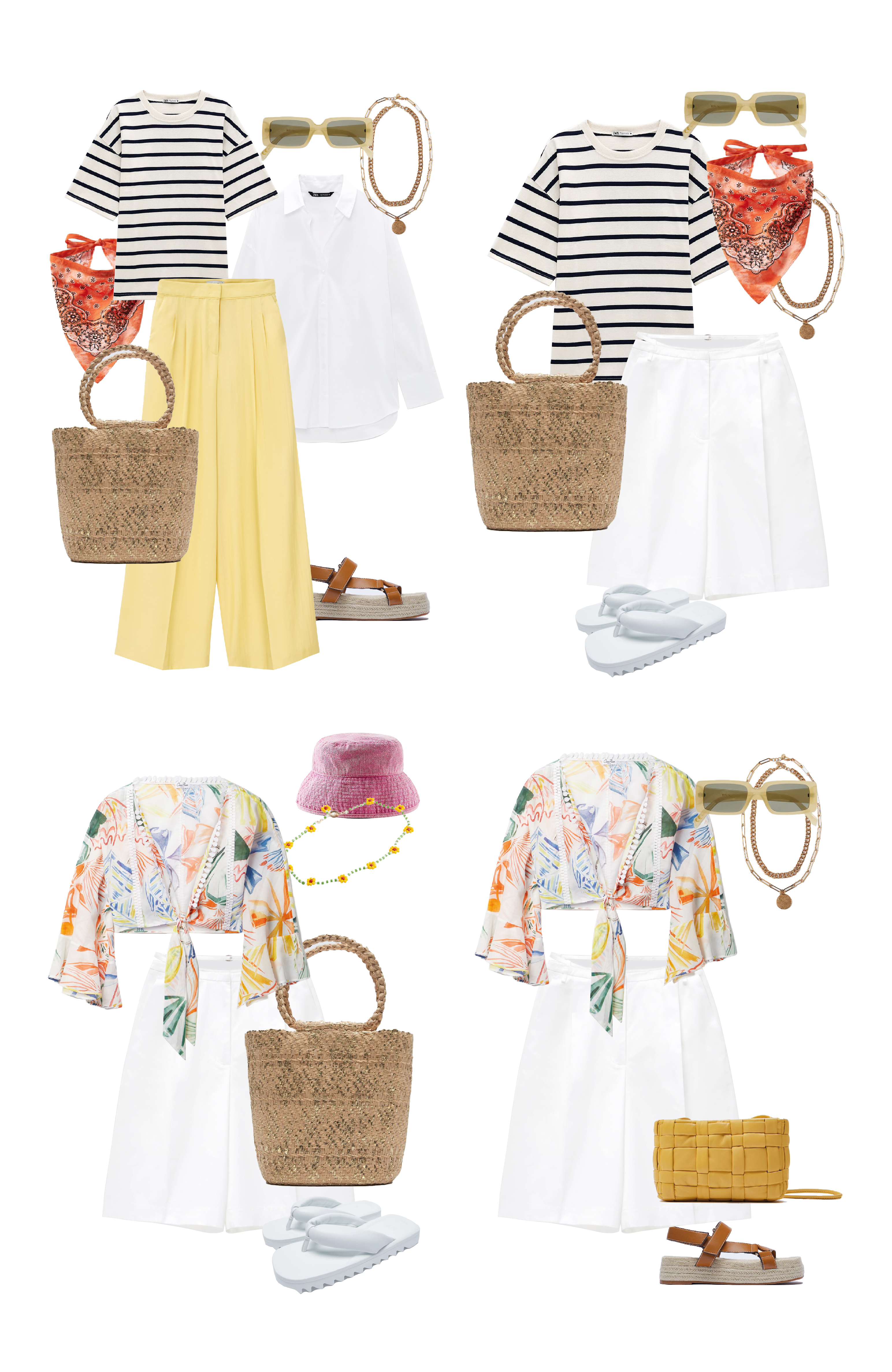 Миксуйте вещи так, как вам нравится. Цветовая гамма и принты — на ваш вкус. В нашей капсуле мы сделали упор на цвет и современные аксессуары — модные бандану и панамку, бусы-фенечки, а также удобную обувь. Но если вам нравится прогуливаться по набережной на каблуках — возьмите мюли или босоножки с тонкими ремешками. Можно закинуть в чемодан даже кеды — все подойдет.