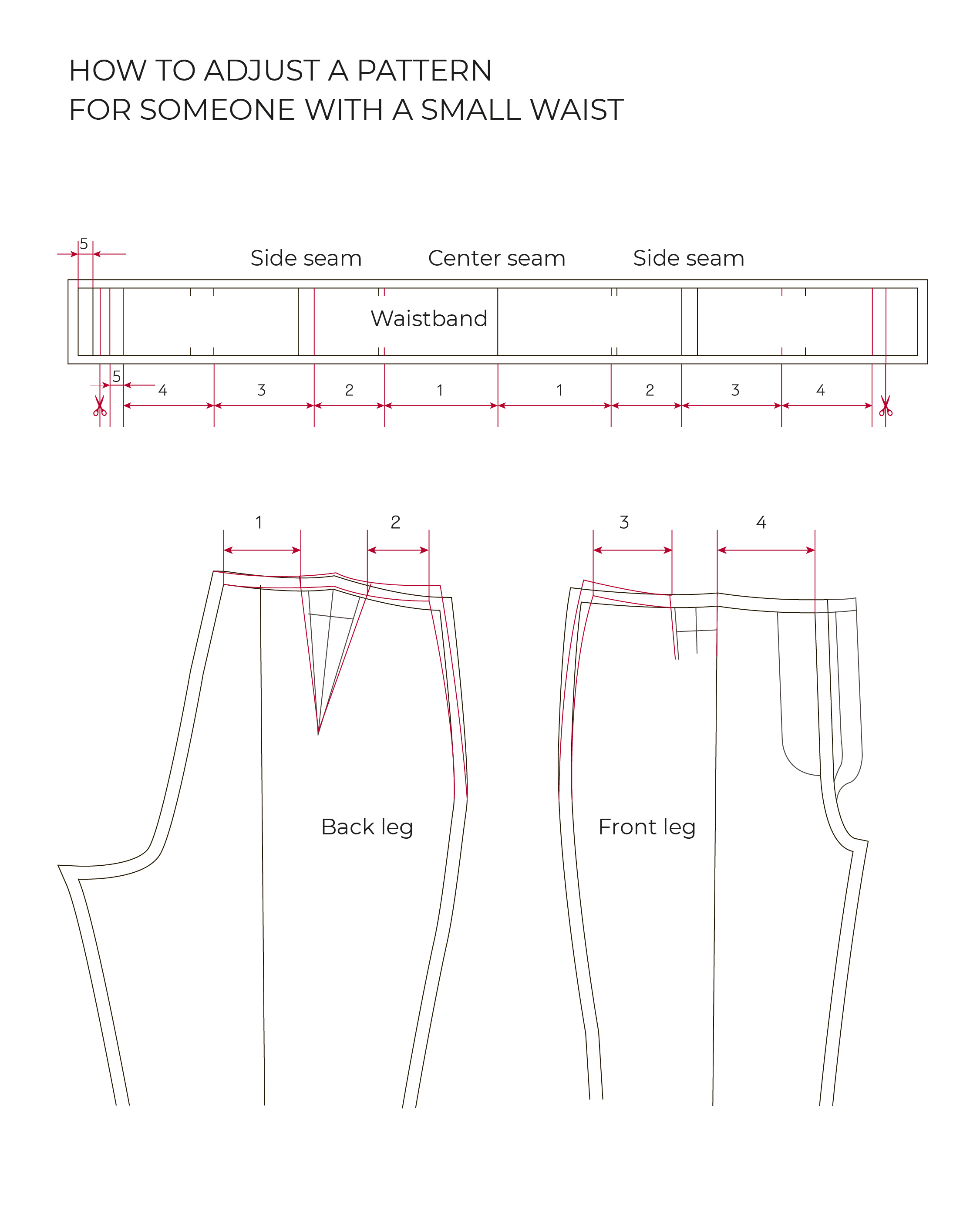 Check the length of the new waistline. It should be equal to half of your waistline measurement (waistline measurement / 2) + ½ waistline ease (check with the ease allowance measurement chart included in your pattern).