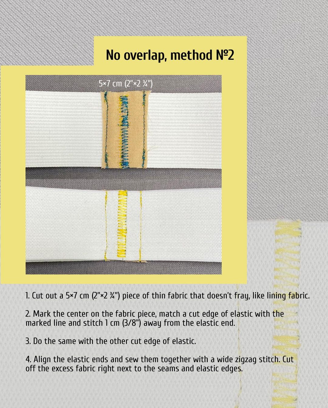 - Align the elastic ends and sew them together with a wide zigzag stitch. Cut off the excess fabric right next to the seams and elastic edges.