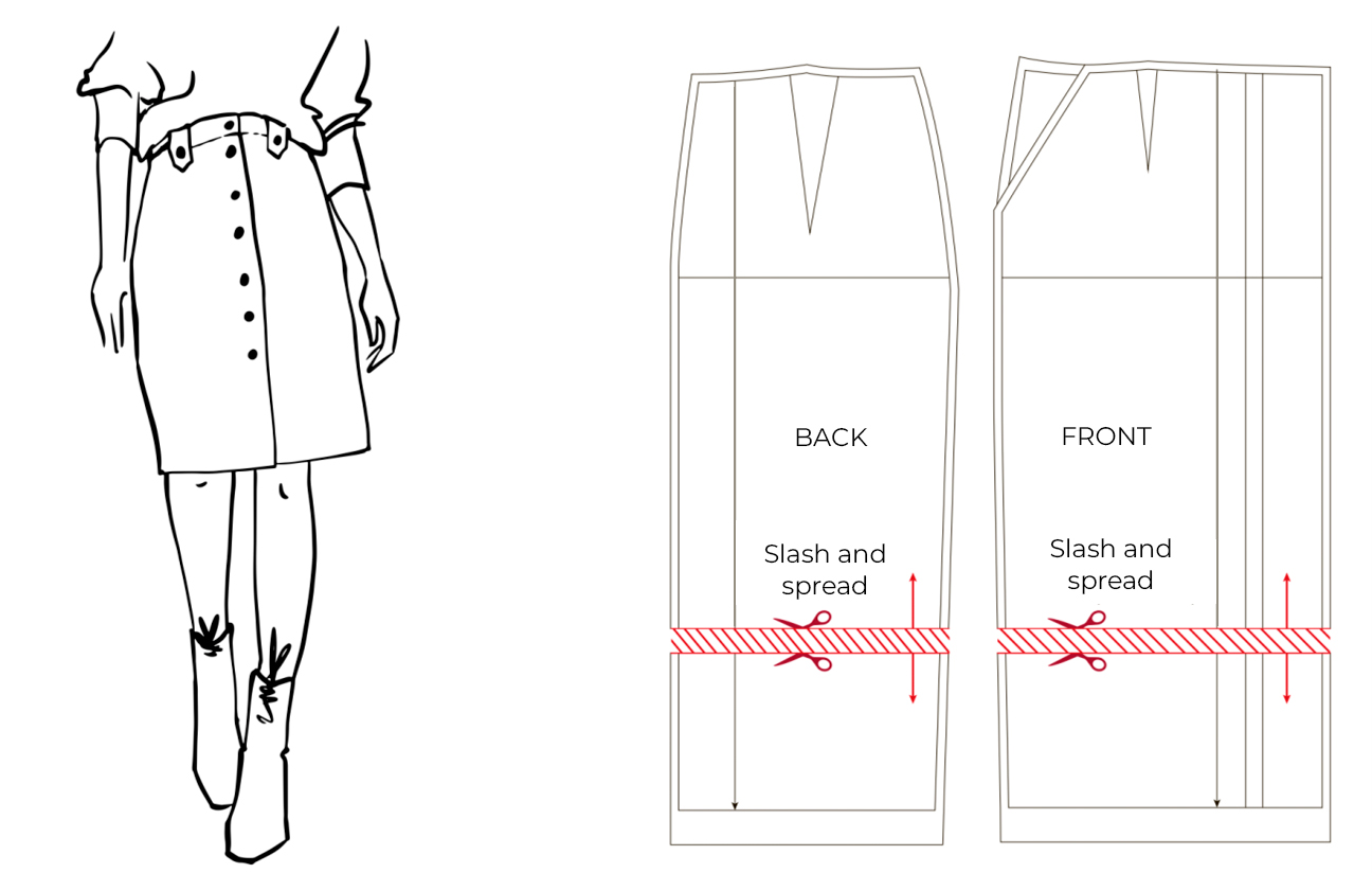 - Cut the pattern piece along the hemline and insert a strip of paper underneath. Spread both sections by the desired amount and glue or tape them to the strip of paper.