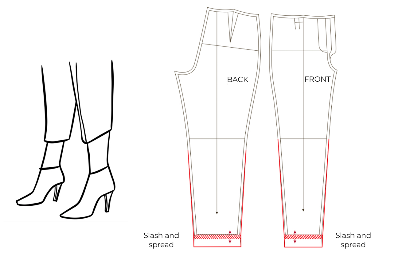 - Redraft the sides and inseams by tracing a straight line from the knee level to the new hemline.
