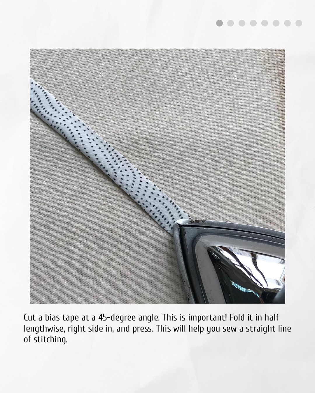 1️. Cut a bias tape at a 45-degree angle. This is important! Fold it in half lengthwise, right side in, and press. This will help you sew a straight line of stitching.