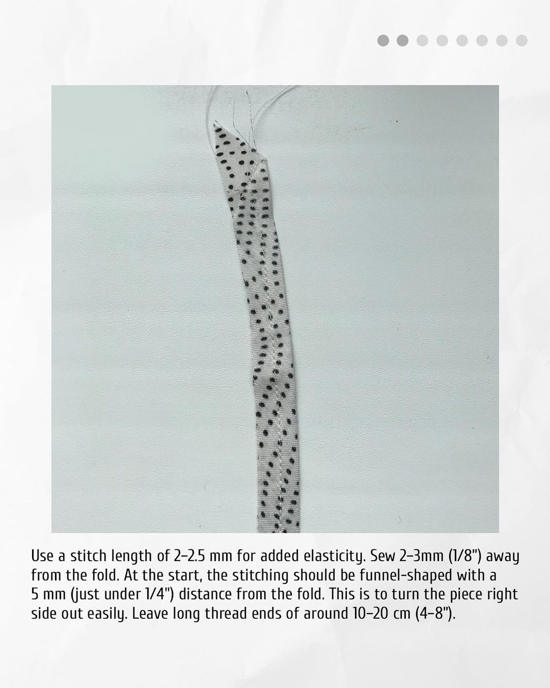 2️. Use a stitch length of 2−2.5 mm for added elasticity. Sew 2−3mm (1/8”) away from the fold. At the start, the stitching should be funnel-shaped with a 5 mm (just under 1/4") distance from the fold. This is to turn the piece right side out easily. Leave long thread ends of around 10−20 cm (4−8”).
